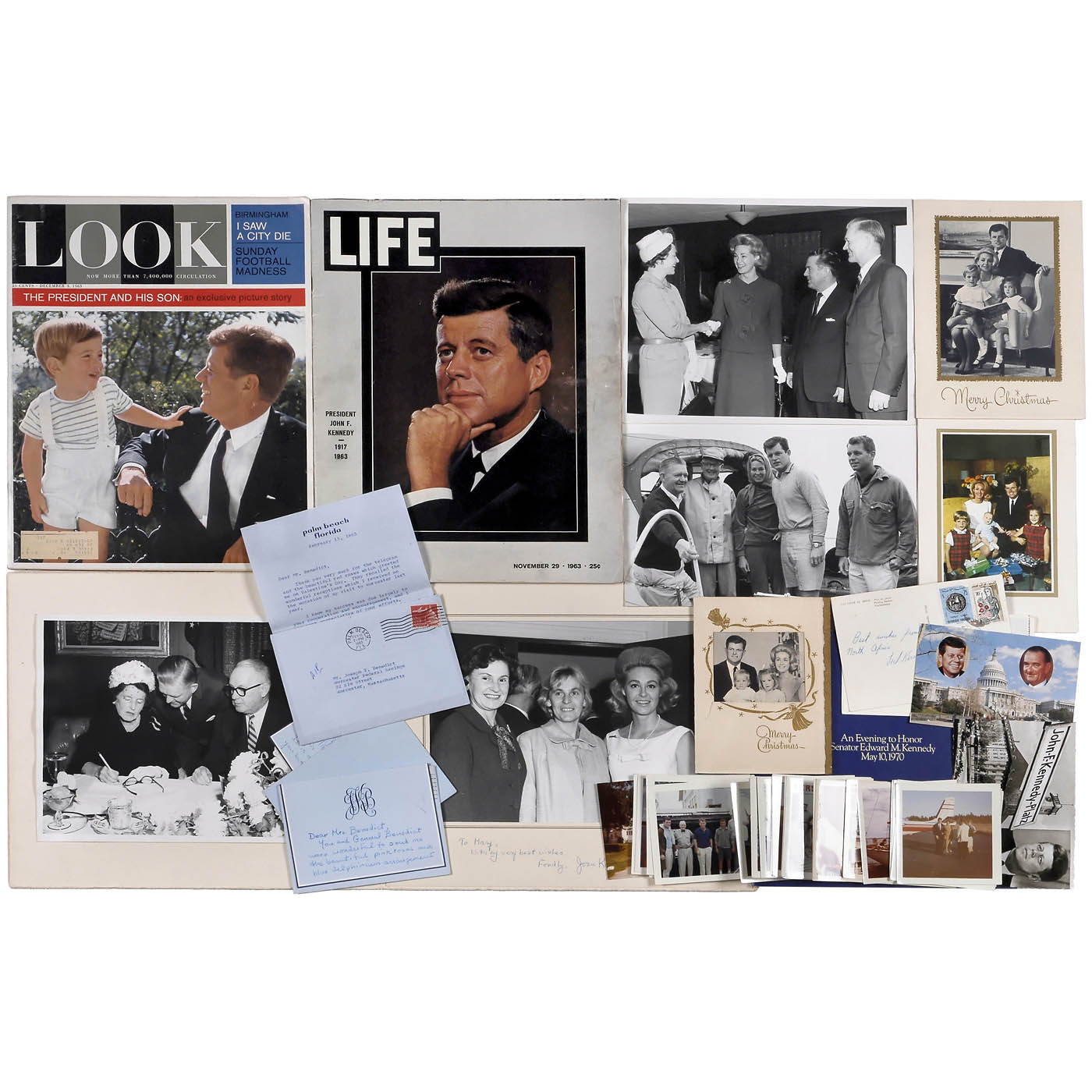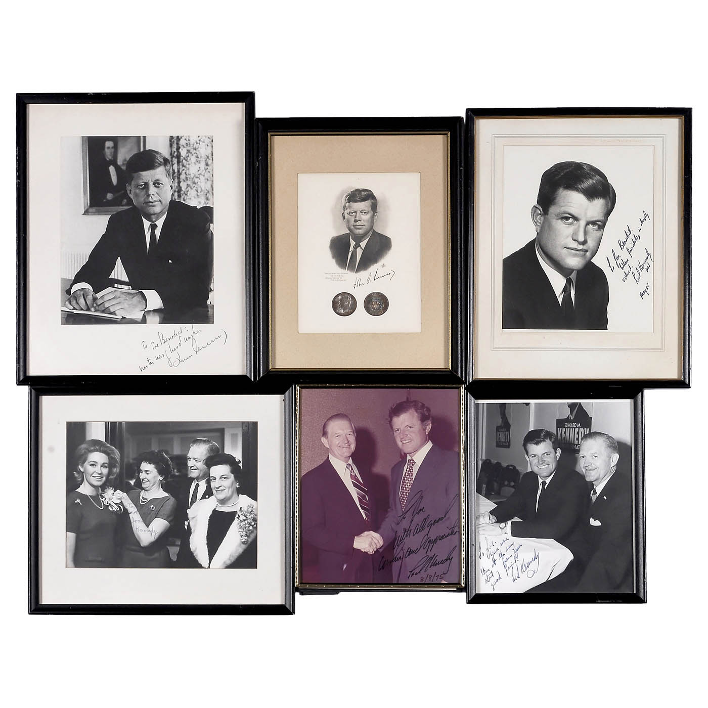 1) John Fitzgerald Kennedy, portrait of JFK seated in front of a table, with inscription "To Joe Benedict, with best wishes John Kennedy" secretarially inscribed by Evelyn Lincoln, secretary II, framed 11 1/3 x 14 ¾ in. - 2) 3 signed photographs of Ted Ke