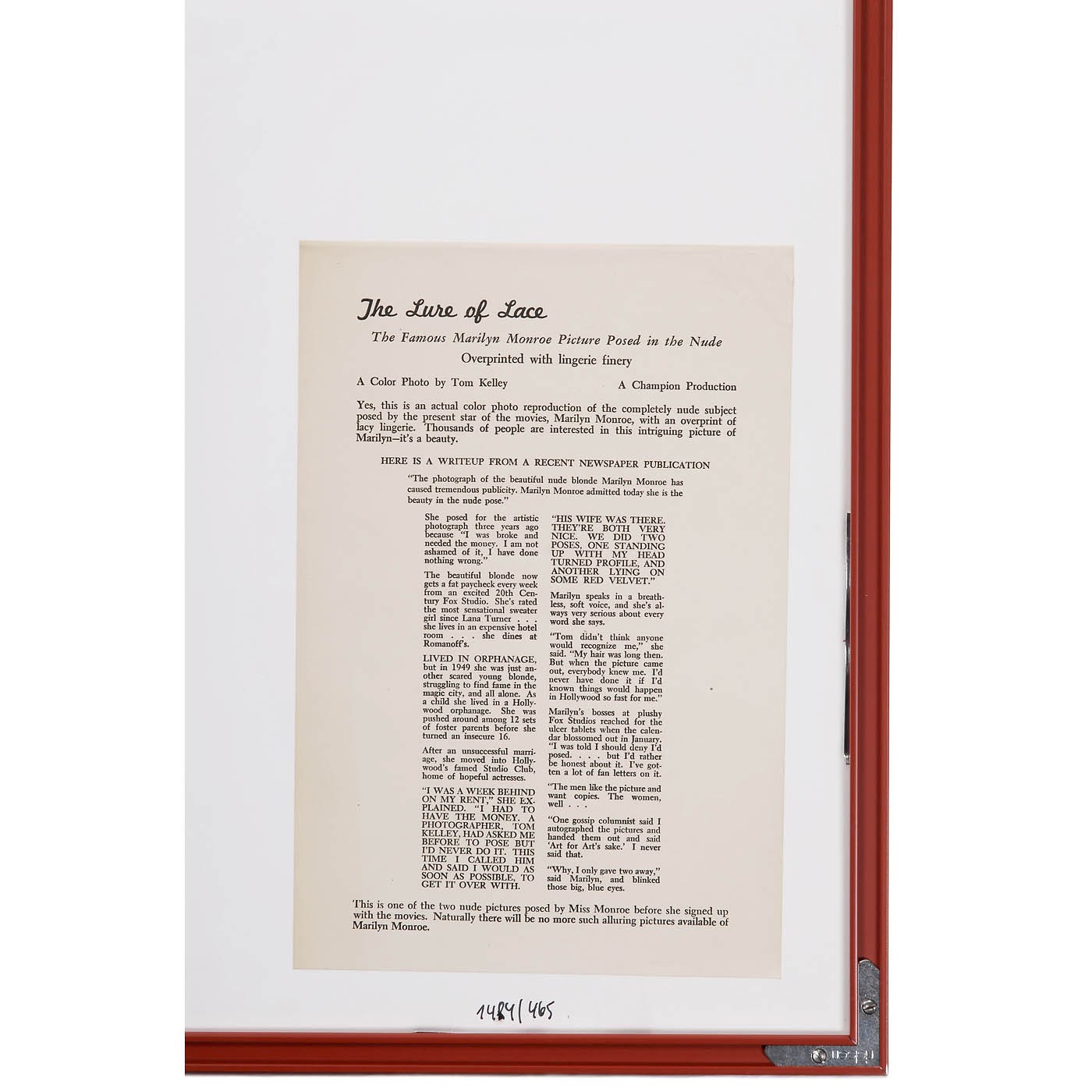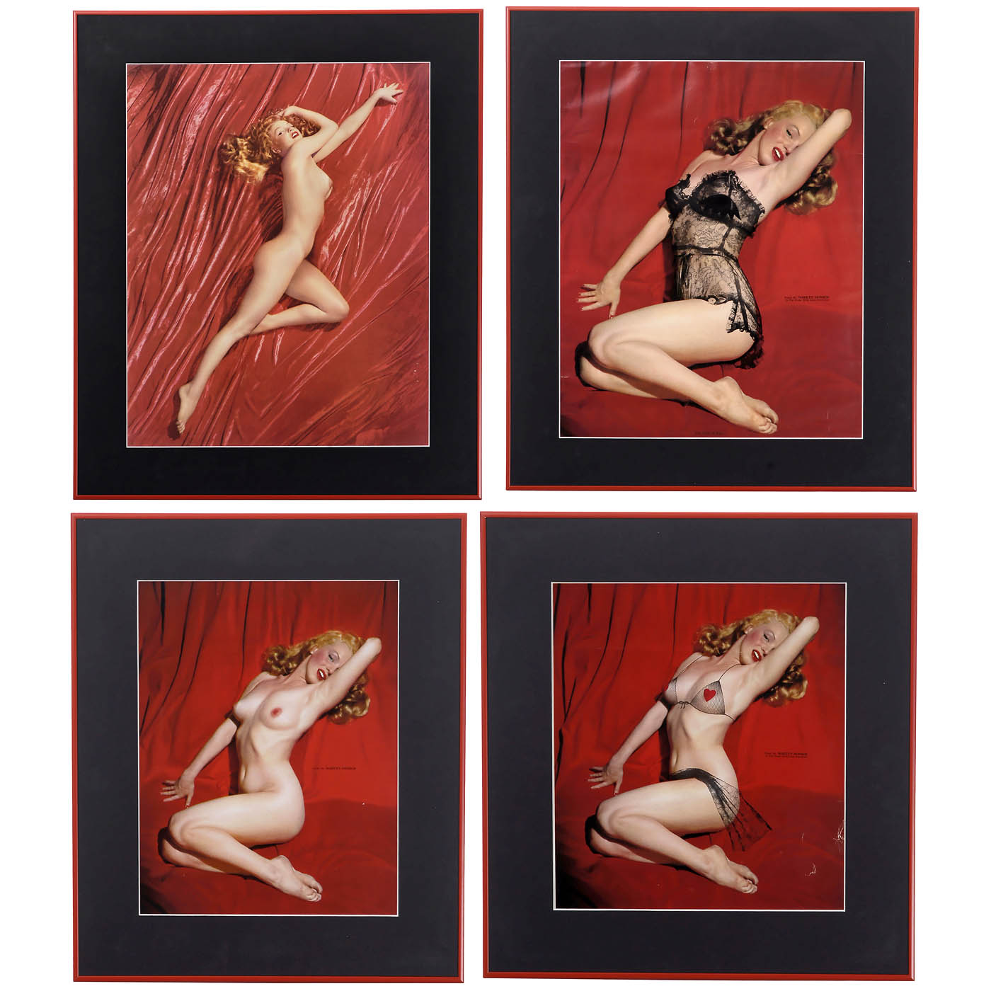 Nude photographs on red velvet, sitting and lying position, two of them with lace overprint (The Lace of Lure), dimensions with passe-partouts and frames 16 x 19 1/3 in. and 21 ¼ x 25 2/5 in.