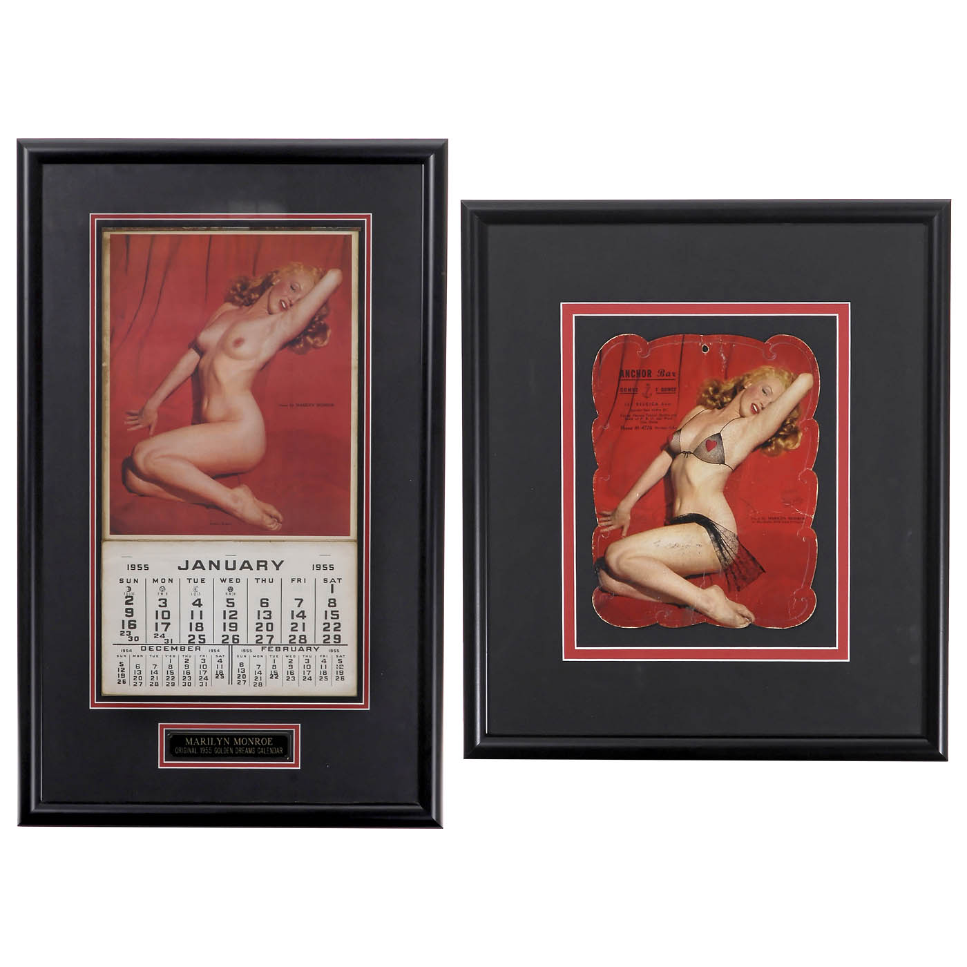 The famous calendar with Marilyn Monroe's nude pose which made her famous all over the world, and which encouraged Hugh Hefner to establish his "Playboy" magazine with Marilyn on the front page of the first issue. - Size 10 x 17 in. With passe-partout and frame. - A nude photo which wrote history. - Extraordinarily rare original collector's item! - In addition: Marilyn Monroe print on cardboard, "In the nude with lace overprint", advertising for the Anchor Bar in Havana, Cuba, size 7 ½ x 9 ½ in.