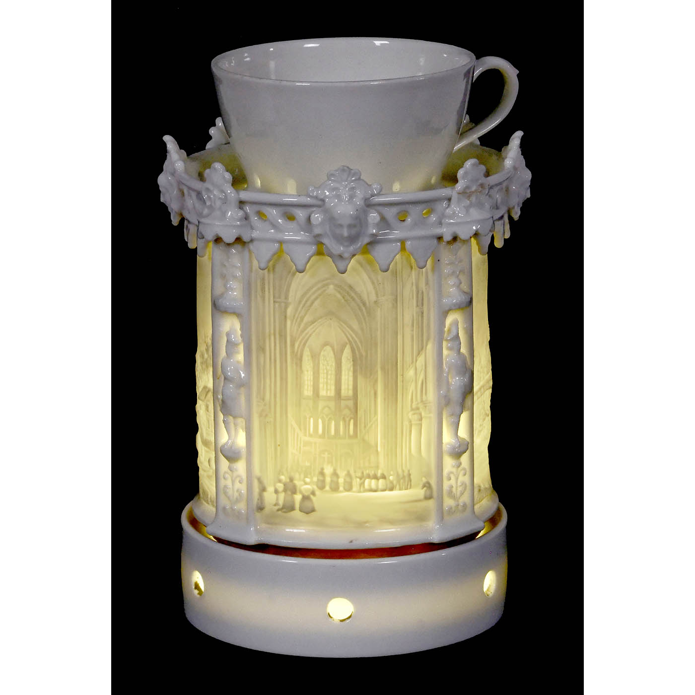 France. White porcelain, height 8 ¼ in., three-part, with tea cup, cylindrical warmer and stand. Around the warmer, with an opening of 2 1/3 in., are four round lithophanes - a cathedral from inside and outside, a romantic river landscape with wagon and a bridge over a river.
