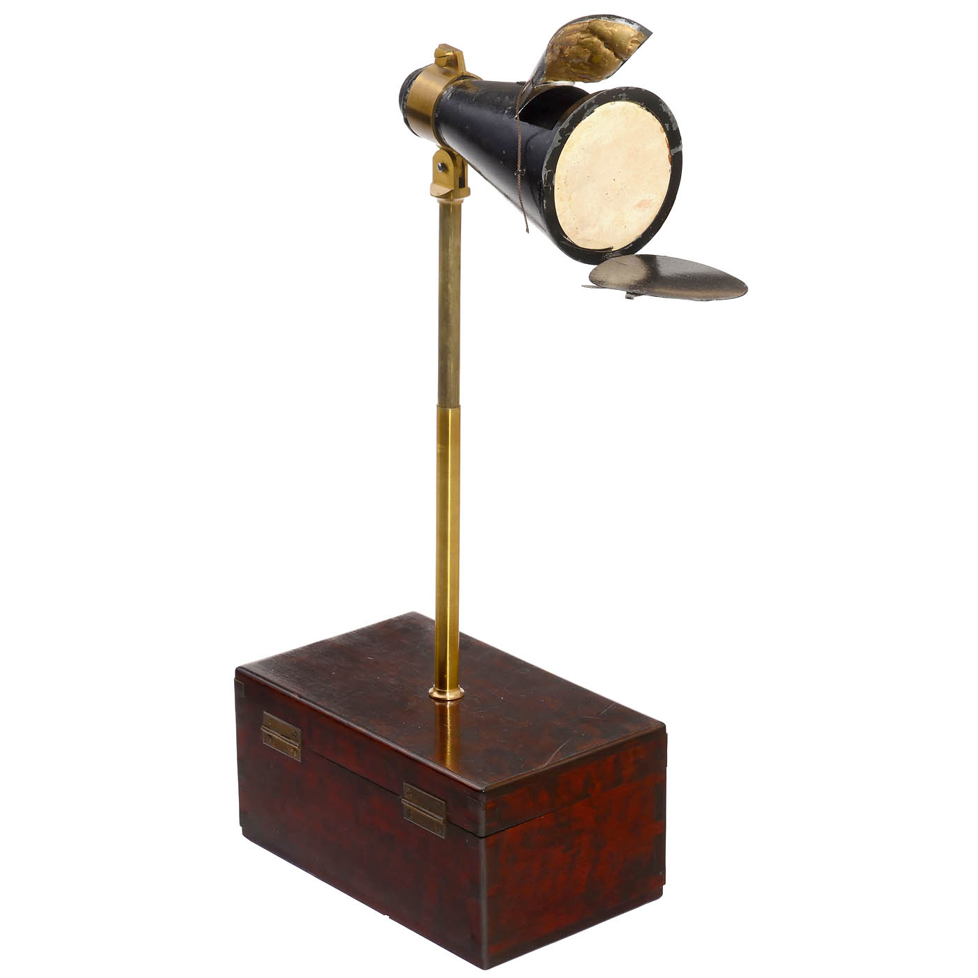 Early conical tin viewer for hand-painted day-and-night images of 3 1/6 in., viewer tube 6 in. long with an image of a crypt, support extends up to 12 in., with polished mahogany box as pedestal. - Extraordinarily rare! - Literature: Richard Balzer, "Optical Amusements …", 1987, p. 57.