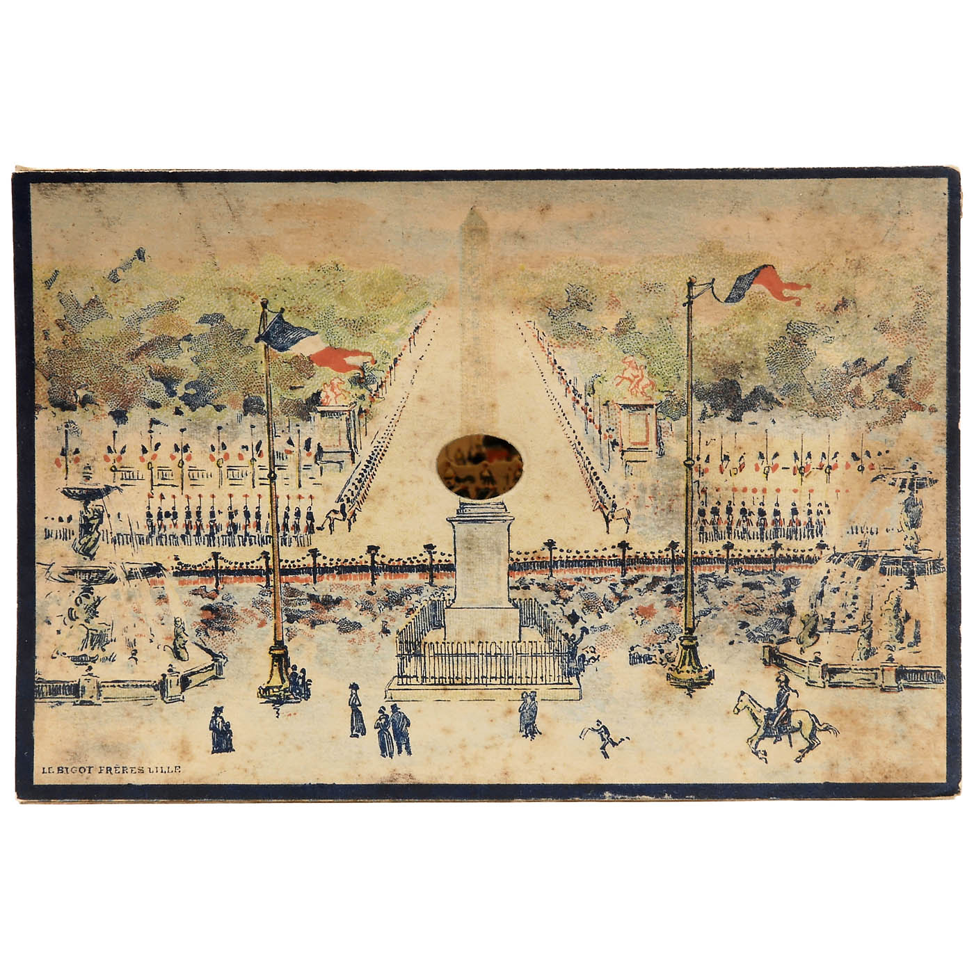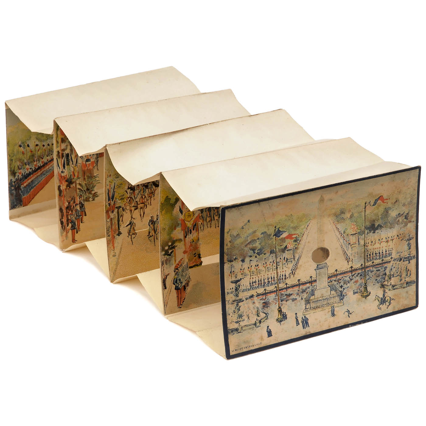 Le Bigot Frères, Lille. One spyhole, 4 sections, size 7 x 4 ½ in., length approx. 14 in., colored lithograph. See: Gestetner Collection, p. 119. Diorama foldable in cardboard box, rear side labeled with "42 60c". Very good condition.
