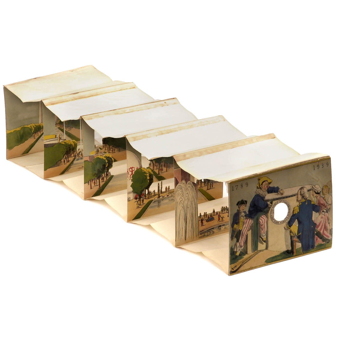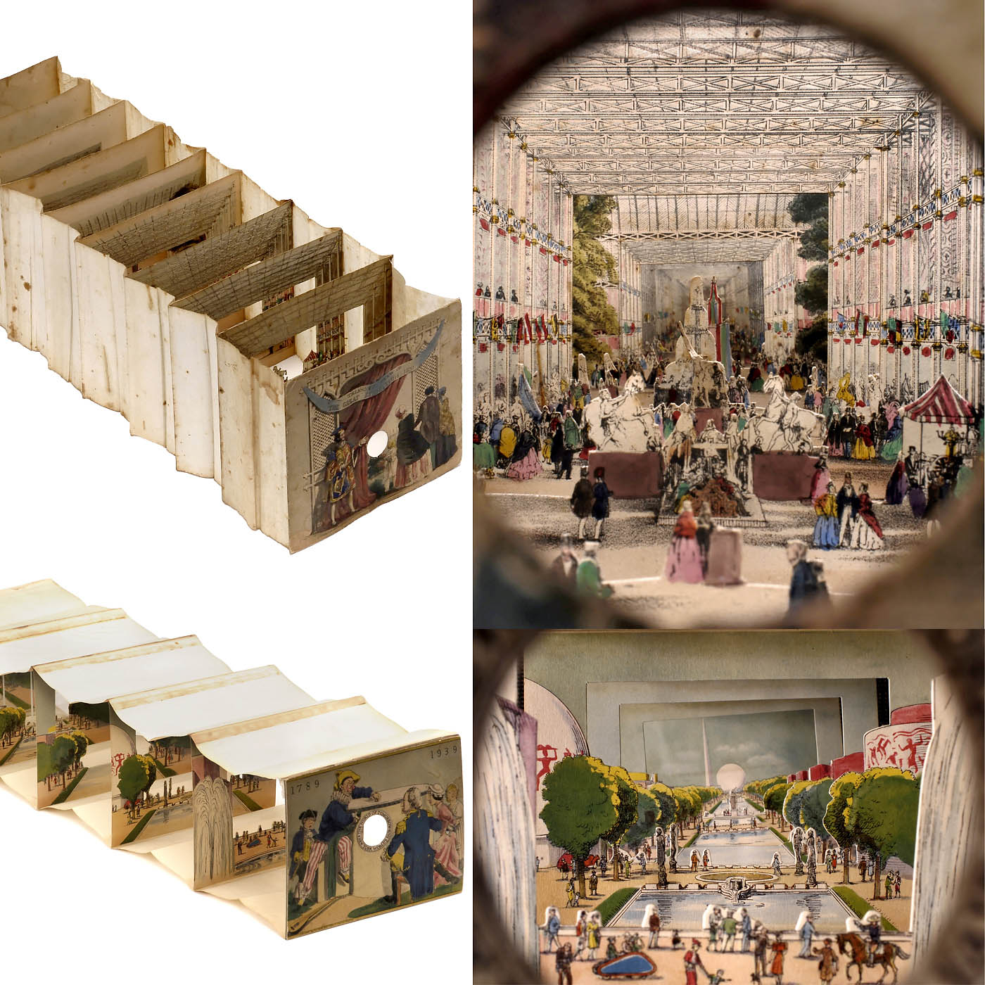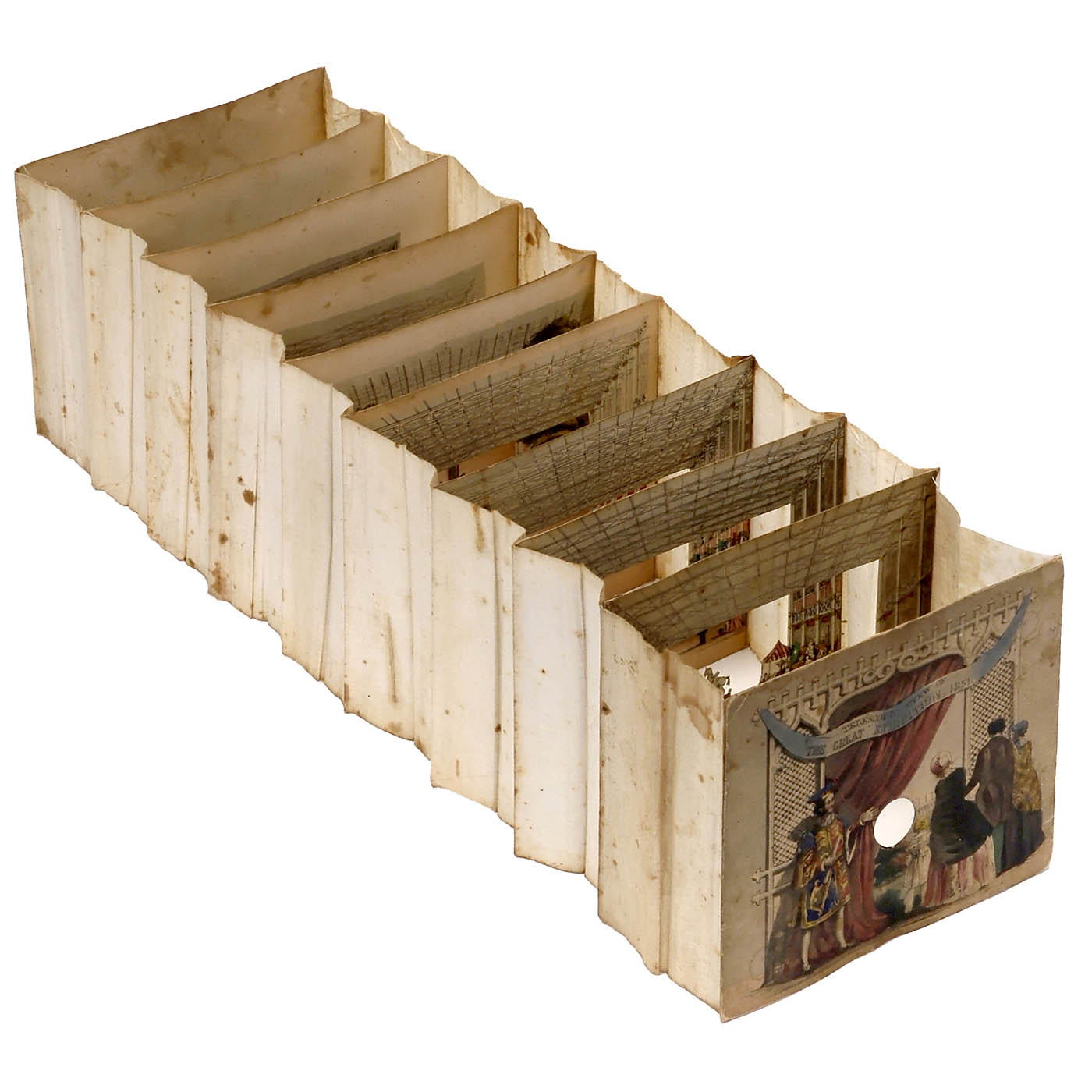 1) C. Moody, Holborn. "Telescopic View of The Great Exhibition, 1851". One spyhole, 9 sections, size 6 ¾ x 6 ¼ in., length approx. 24 in., (hand?-)colored lithograph. See: Gestetner Collection, p. 204. Diorama foldable in cardboard box. (3-/3) - And: 2) USA. "New York World's Fair - The World of Tomorrow". One spyhole, 5 sections, size 6 2/3 x 5 in., length approx. 25 2/5 in. See: Gestetner Collection, p. 226. Diorama foldable in cardboard box. (3/3) - About the history of World Exhibitions.
