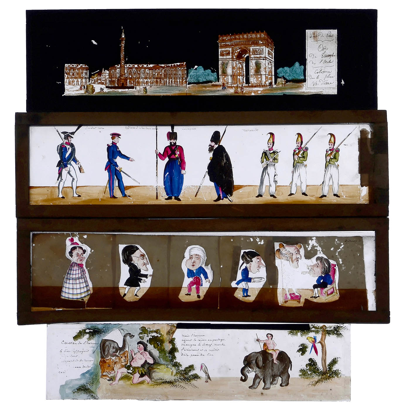 Mostly from France, slides from 3 ½ x 13 in. up to 4 1/3 x 16 ½ in., one without wood frame.