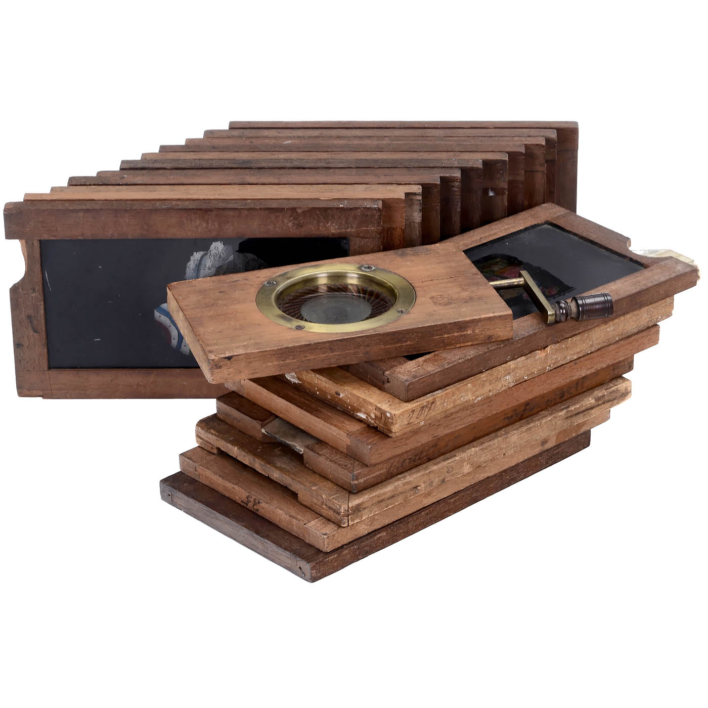 England. 1) 18 assorted slides, all 4 x 6 4/5 in., burlesque subjects and some with rolling eyes. - And: 2) Chromatrope, with turning windmill, 3 1/6 x 5 in.