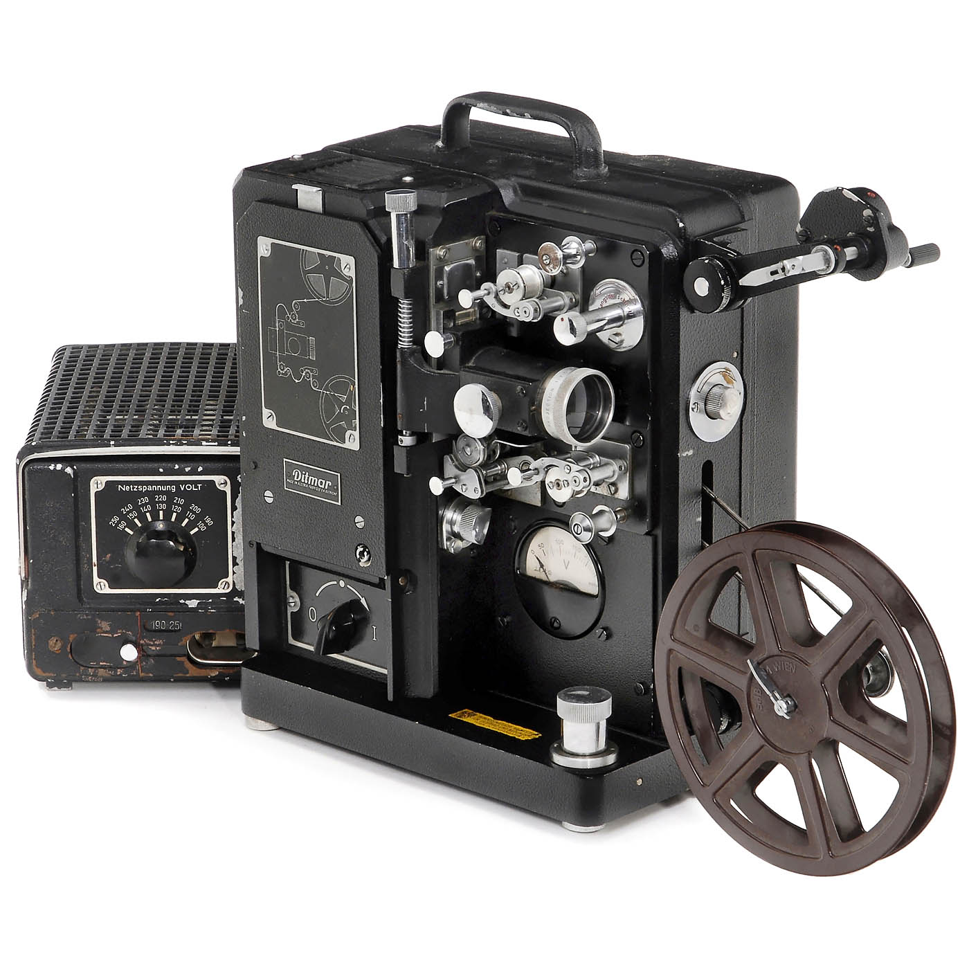 Siemenswerk, Berlin. 16mm projector for 300m spools. The "Klangfilm" is for optical sound (multiplier not present). To minimize the noise of the projector, the equipment is in a wood case. Electric functions not tested. - In addition: 16mm Ditmar projector.