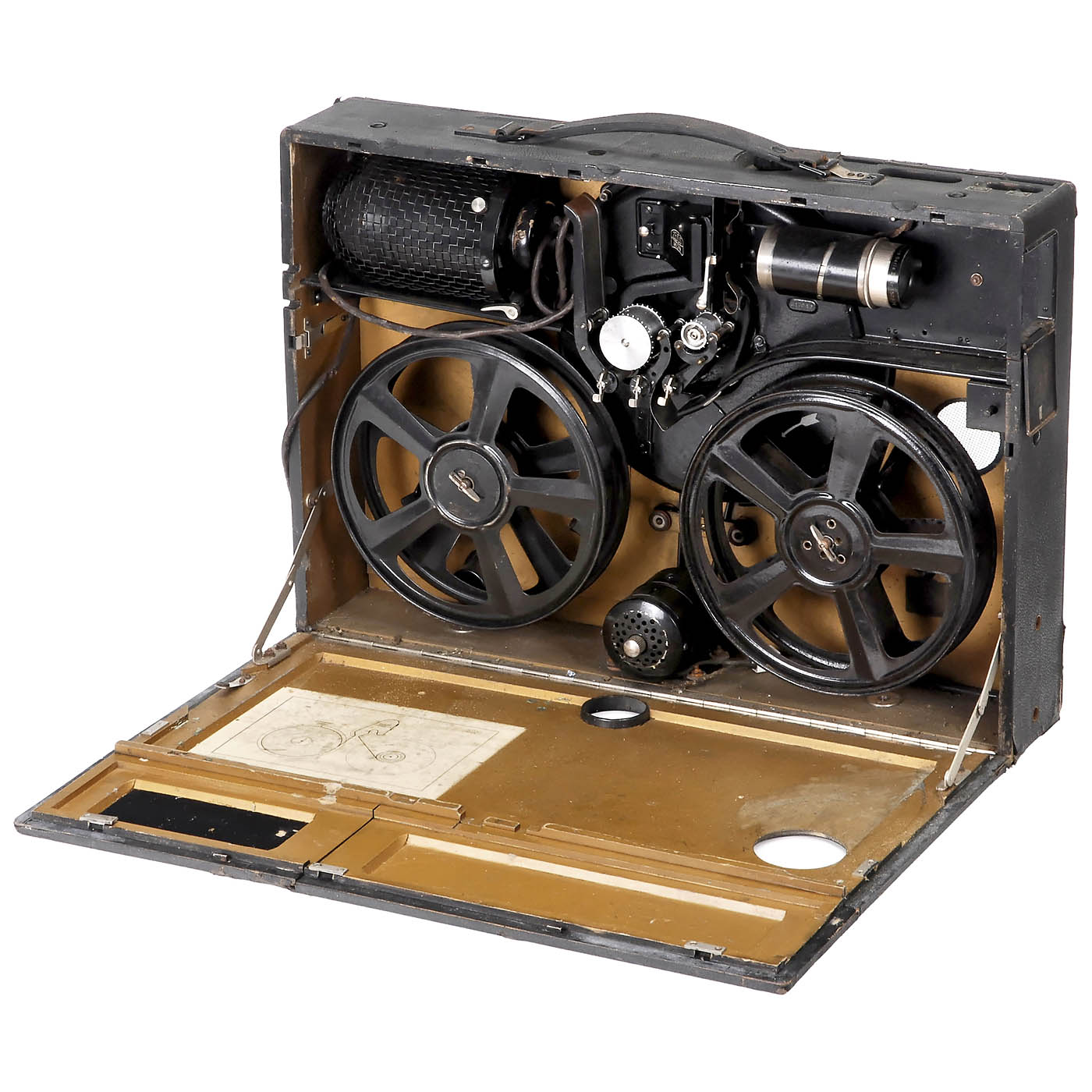Zeiss Ikon, Dresden. Portable projector for 35mm film with 300m spools (2 spools enclosed). Lens of 10 cm. Swing-in lamphouse, drive by electric motor. Electric functions untested.
