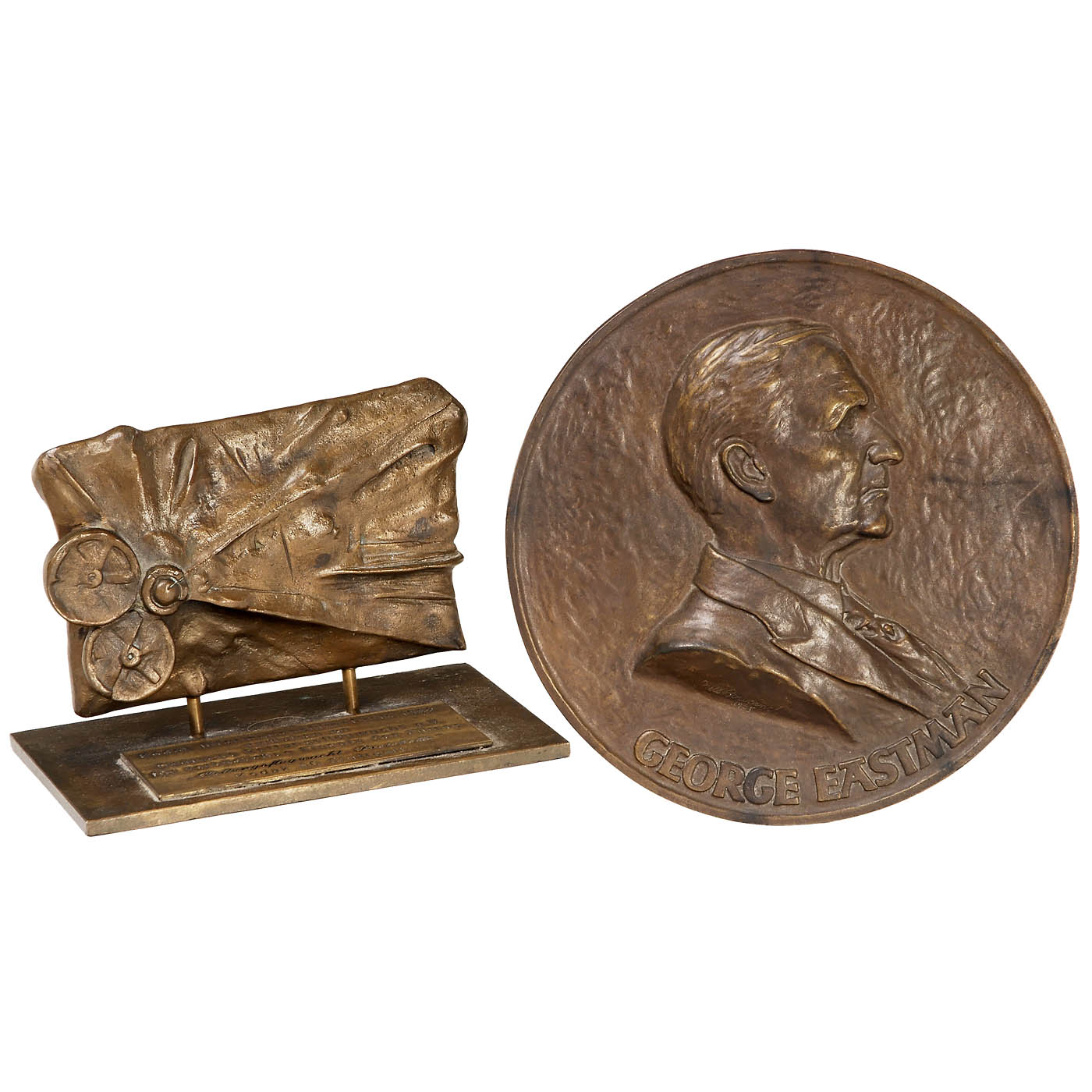 Eastman Kodak. 1) Bronze medal "George Eastman", Ø 7 4/5 in., wall-mount on back. - And: 2) "Kodak Informationsfilm-Preis 1982" presented to "Deutsche Rettungsflugwacht e.V.", Stuttgart. Bronze, weight 2,9 kg, 6 ¾ x 4 x 5 in. Marked "M N 78" on reverse.