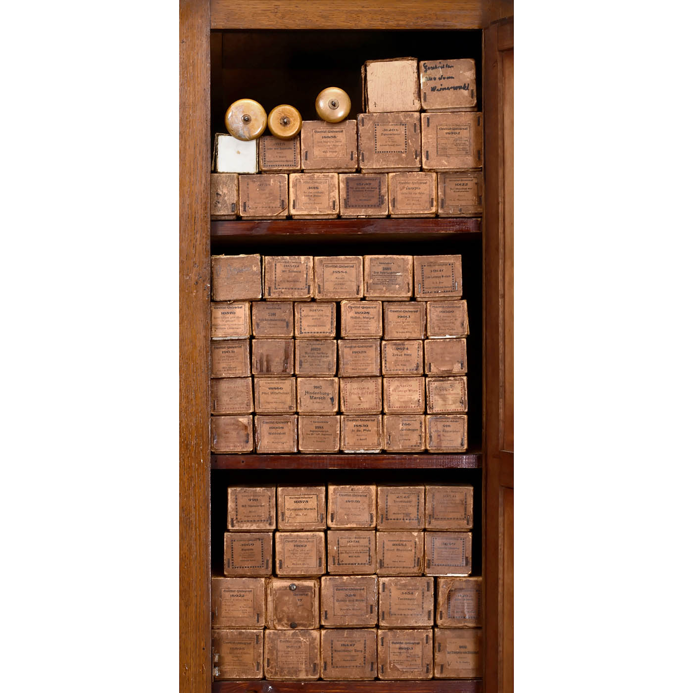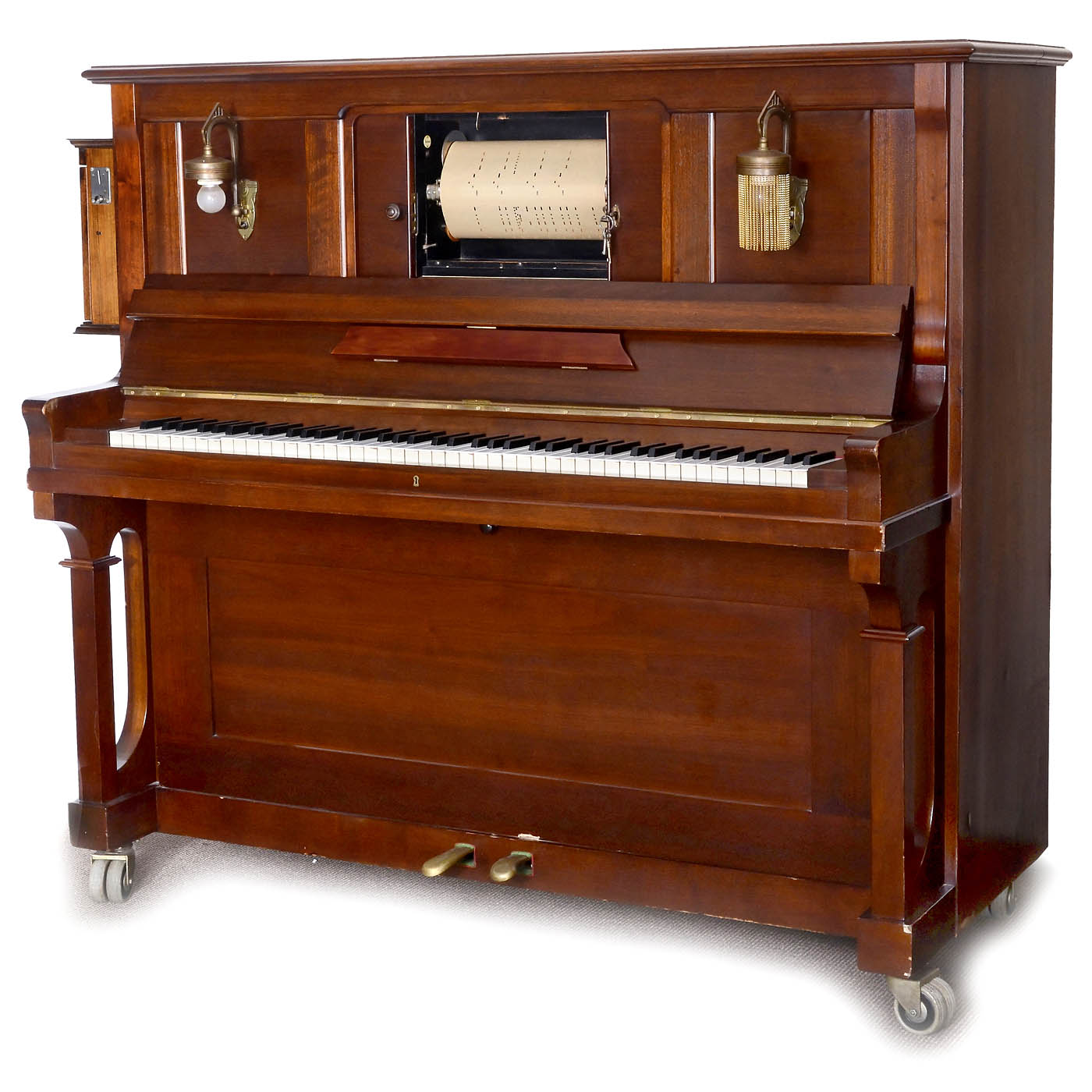 Electric piano, walnut case, size 60 ½ x 29 ½ x 55 in., pneumatic system, 230-volt electric motor drive, lateral coin box (missing glass), 2 electric Art Nouveau lamps (one without decoration), with 66 "Clavitist Universal" rolls. The piano needs tuning, otherwise in good restored and playing condition.