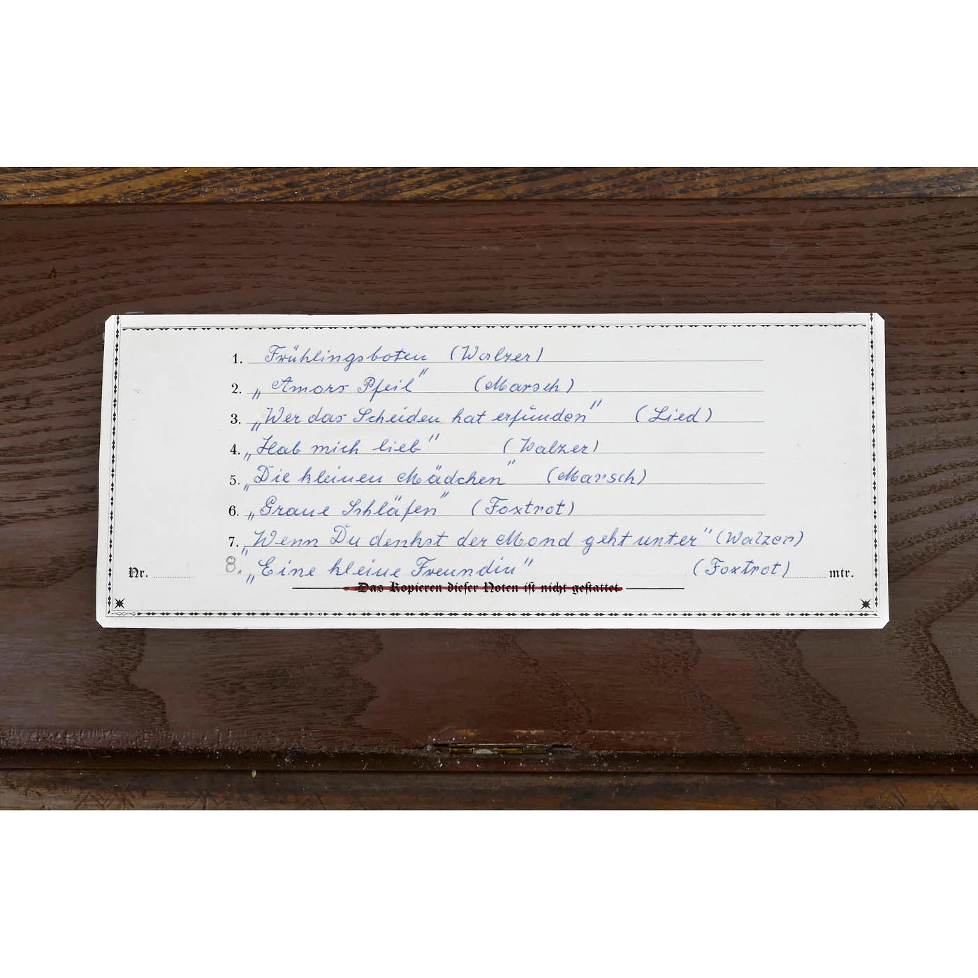 Trumpet organ, with legend "Eduard Hilger Friedenstr. 106 Berlin ". 41 keys, 8 airs, 13 wood trumpet pipes, 13 violin pipes, 15 pan flutes, covered pipes and bass underside pipes, 3 optional stops, front with inlays, overall size 27 1/5 x 16 ½ x 26 ¾ in. - Very good restored and excellent playing condition!