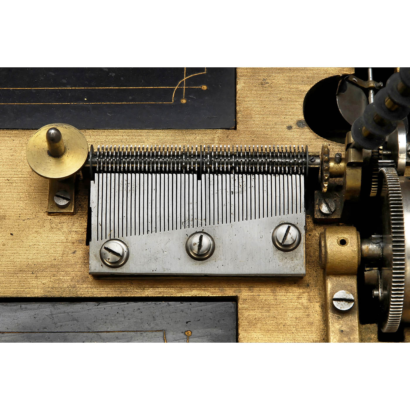 Manufacturer: Bruno Rückert, Leipzig. For discs of 10 2/3 in., 51 teeth in single comb (complete), nickeled visible spring motor, walnut case (19 ½ x 13 ¾ x 7 ½ in.), Orphenion lettering in lid, with 25 discs. Plays well. - Orphenion boxes are relatively scarce today, they are well-made and have a sound quite different from other makers.