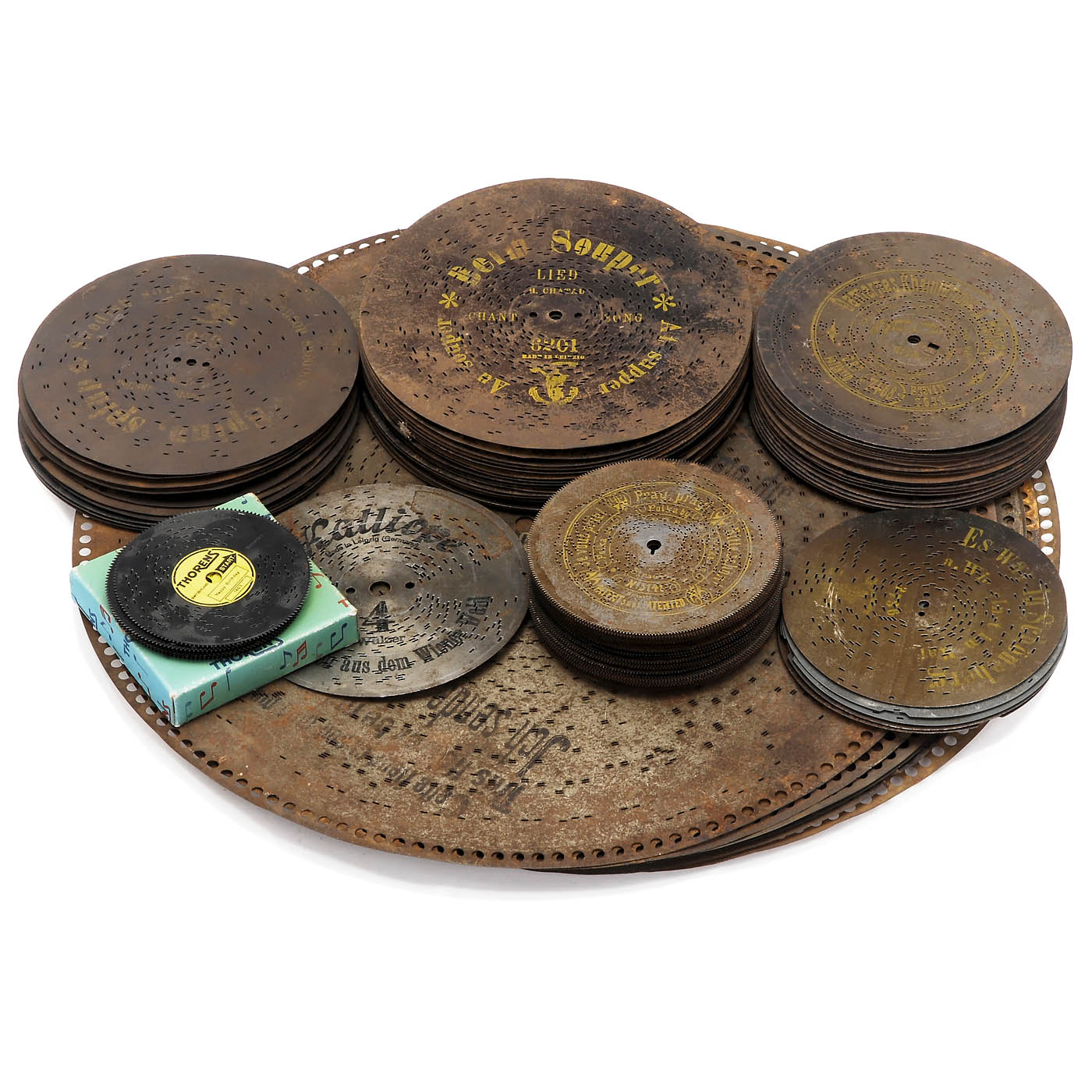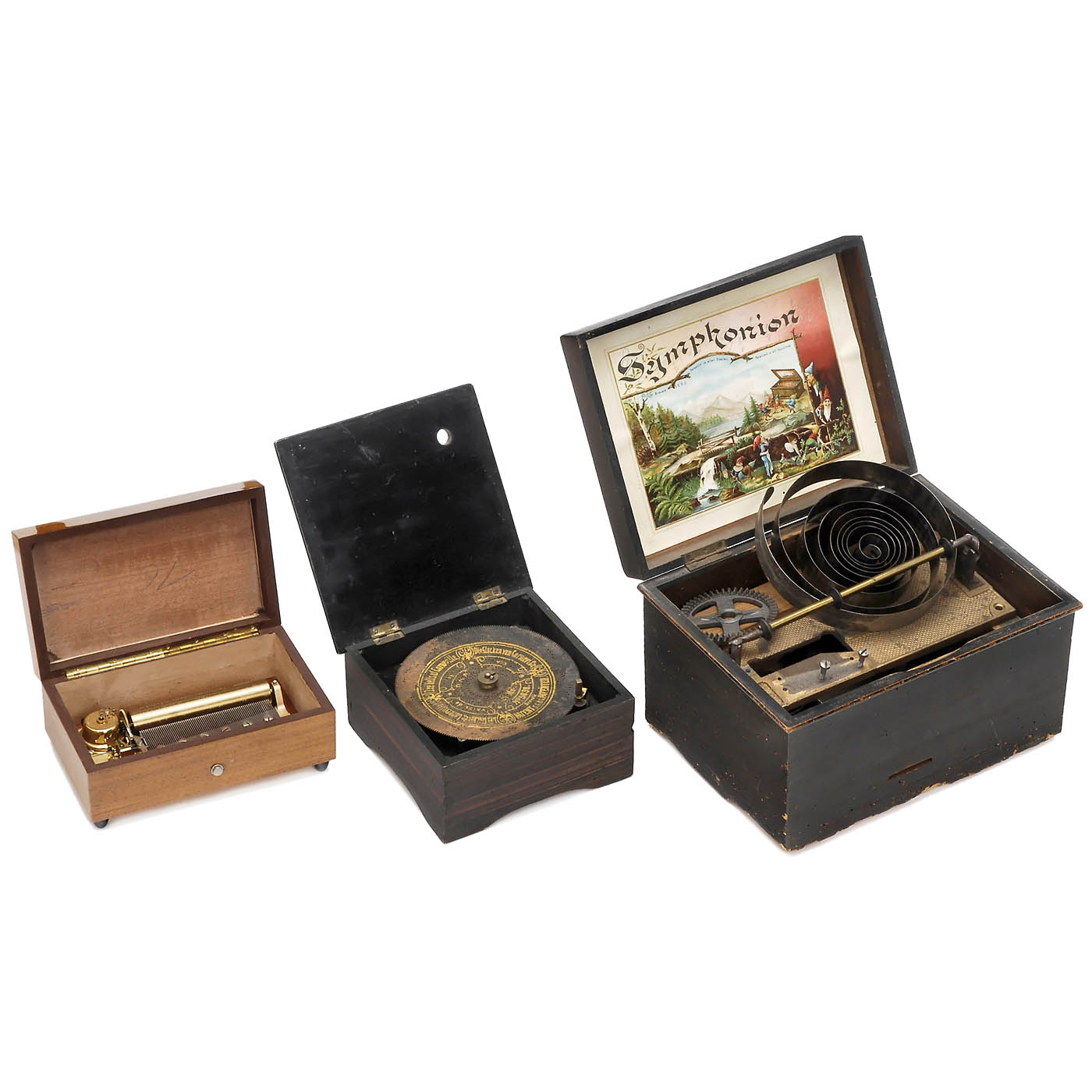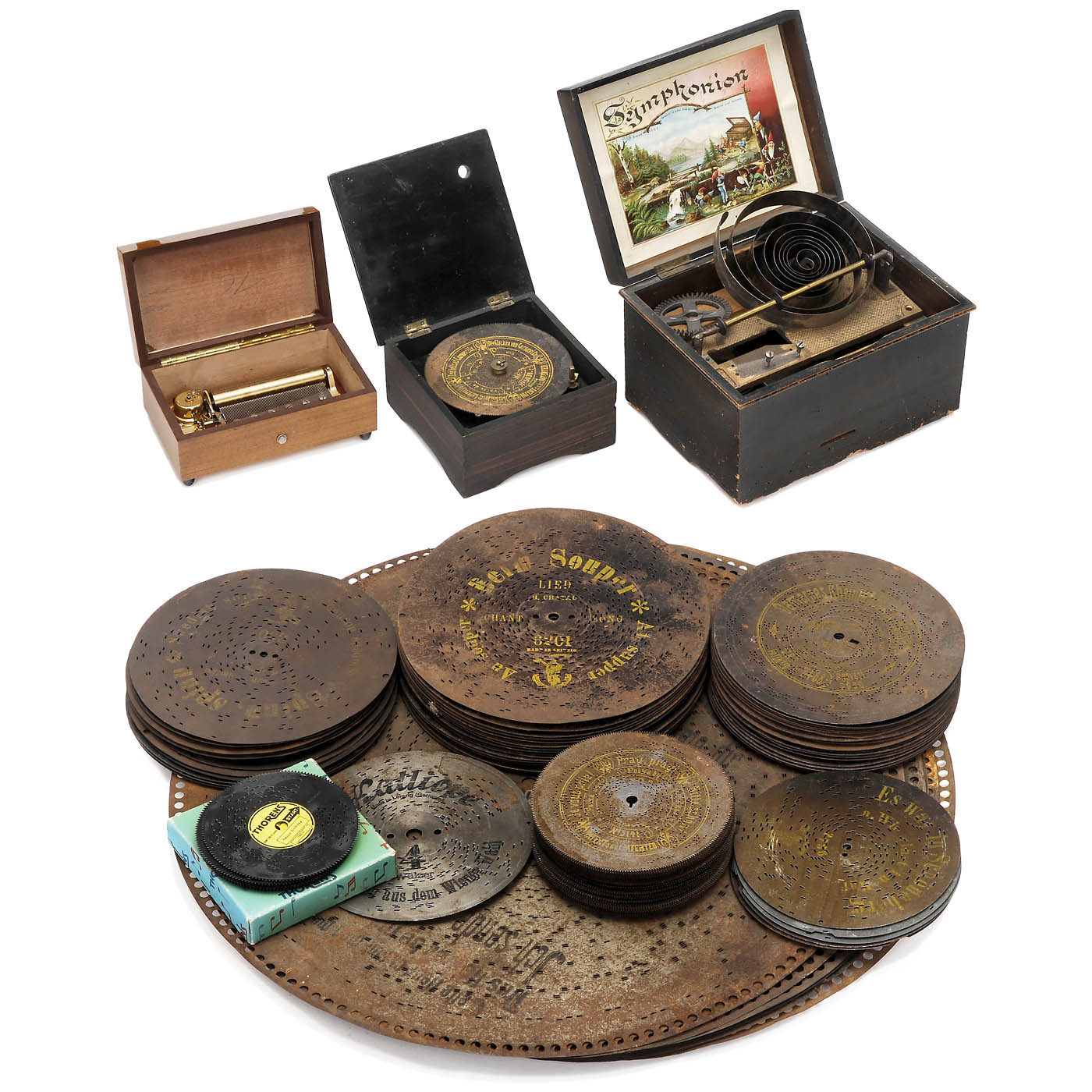 1) Reuge 3/72 cylinder musical box, 3 tunes, 72 teeth in steel comb (complete), in polished walnut case, very good playing condition. - 2) Symphonion no. 28 "Manivelle", for Ø 5 ¾ in. discs, 40 teeth in steel comb (complete), missing crank, imitation rosewood case with ornamental cover, with 21 discs. - 3) Symphonion no. 10, for 7 ½ in. discs, disassembled, case with wormholes, with 18 discs. - And: 4) Discs (partly rusty): 17 x Polyphon, Ø 9 ½ in., 9 x Polyphon, Ø 8 in., 2 x Symphonion, Ø 8 ¼ in., 5 x Polyphon, Ø 6 ½ in., 1 x Kalliope, Ø 7 in., 5 x Thorens, Ø 4 1/3 in., 6 x Symphonion, Ø 21 ¼ in.