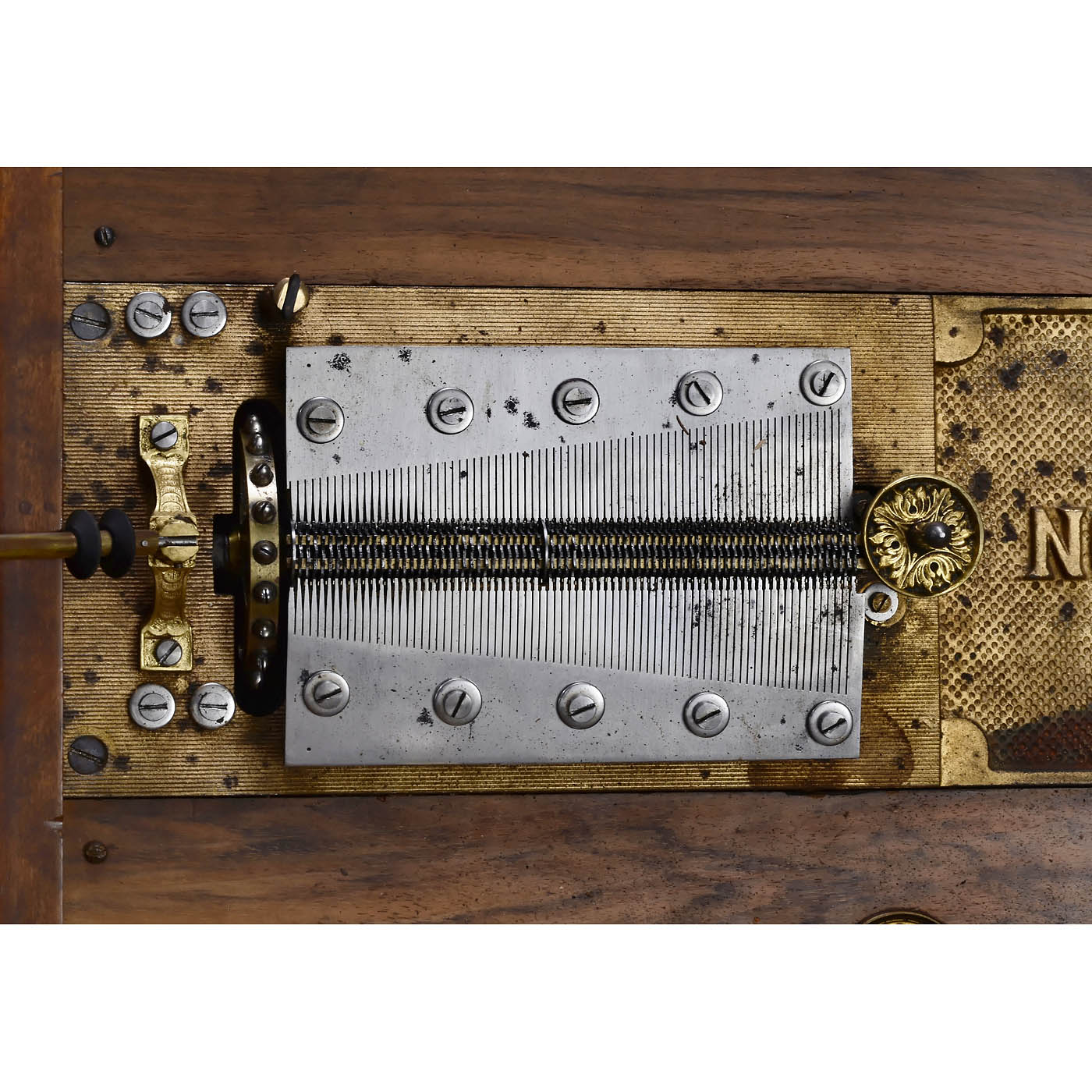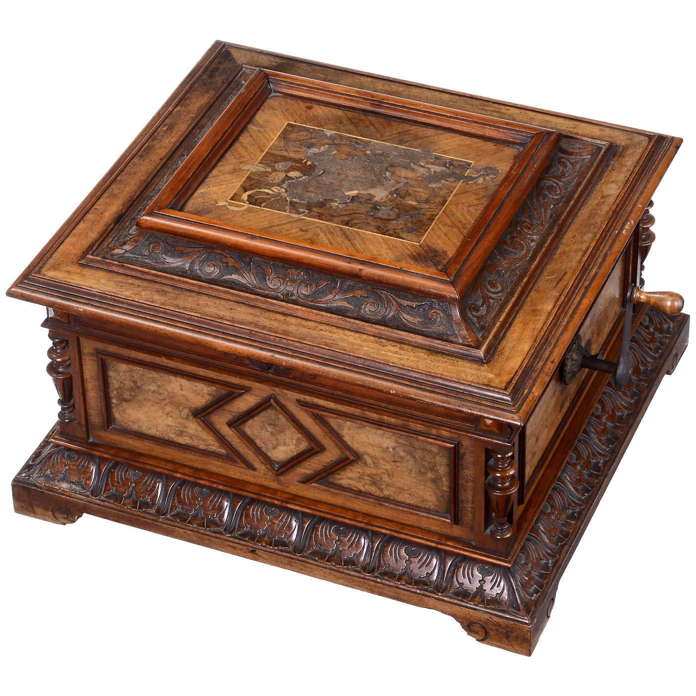 For 15 ¾-inch discs. Manufactured by Polyphon Musikwerke, Leipzig. 154 teeth in duplex comb, complete! Walnut case with elaborate carvings, attractive original lithograph in lid, good original condition, inlays on lid incomplete. With one disc. Good playing condition, bass teeth in need of adjustment. - One of the most beautiful Polyphon table models!