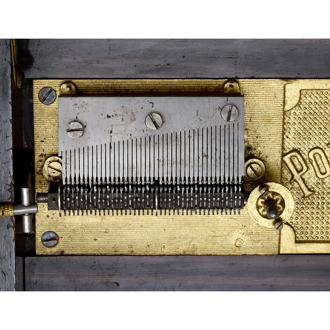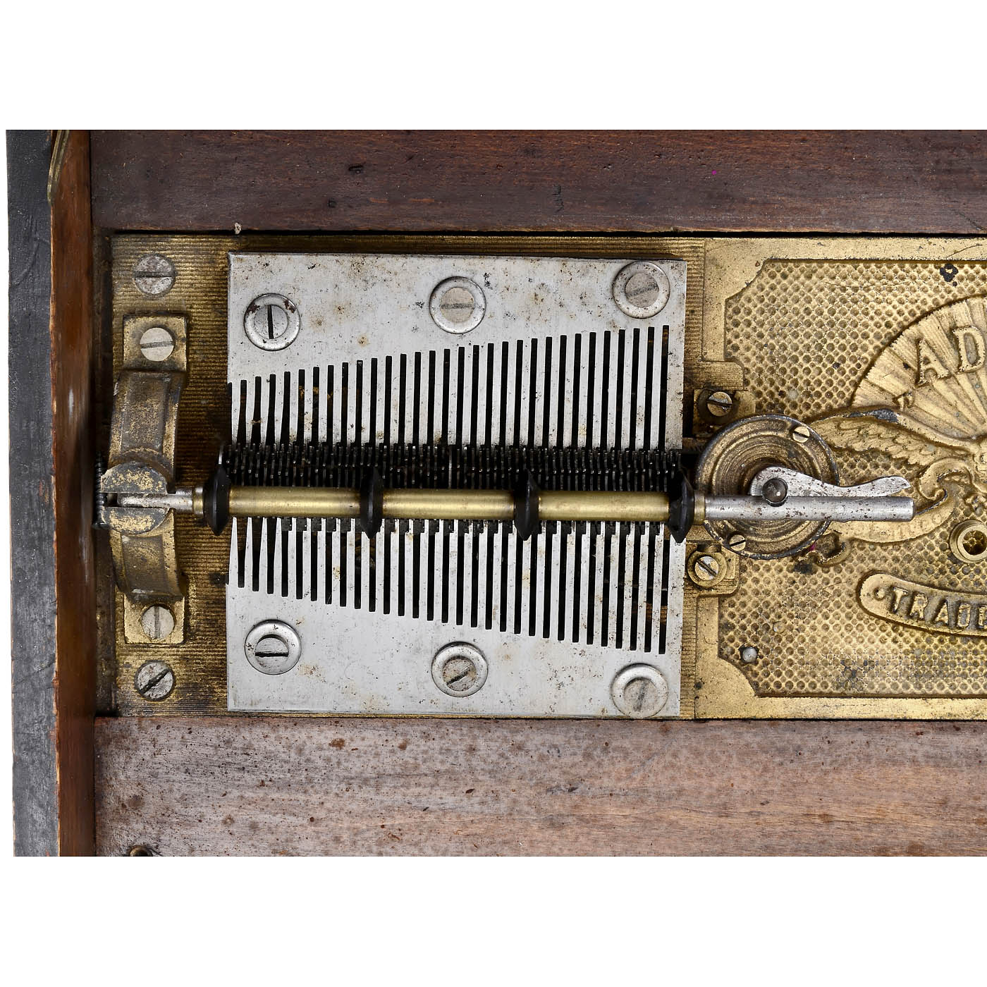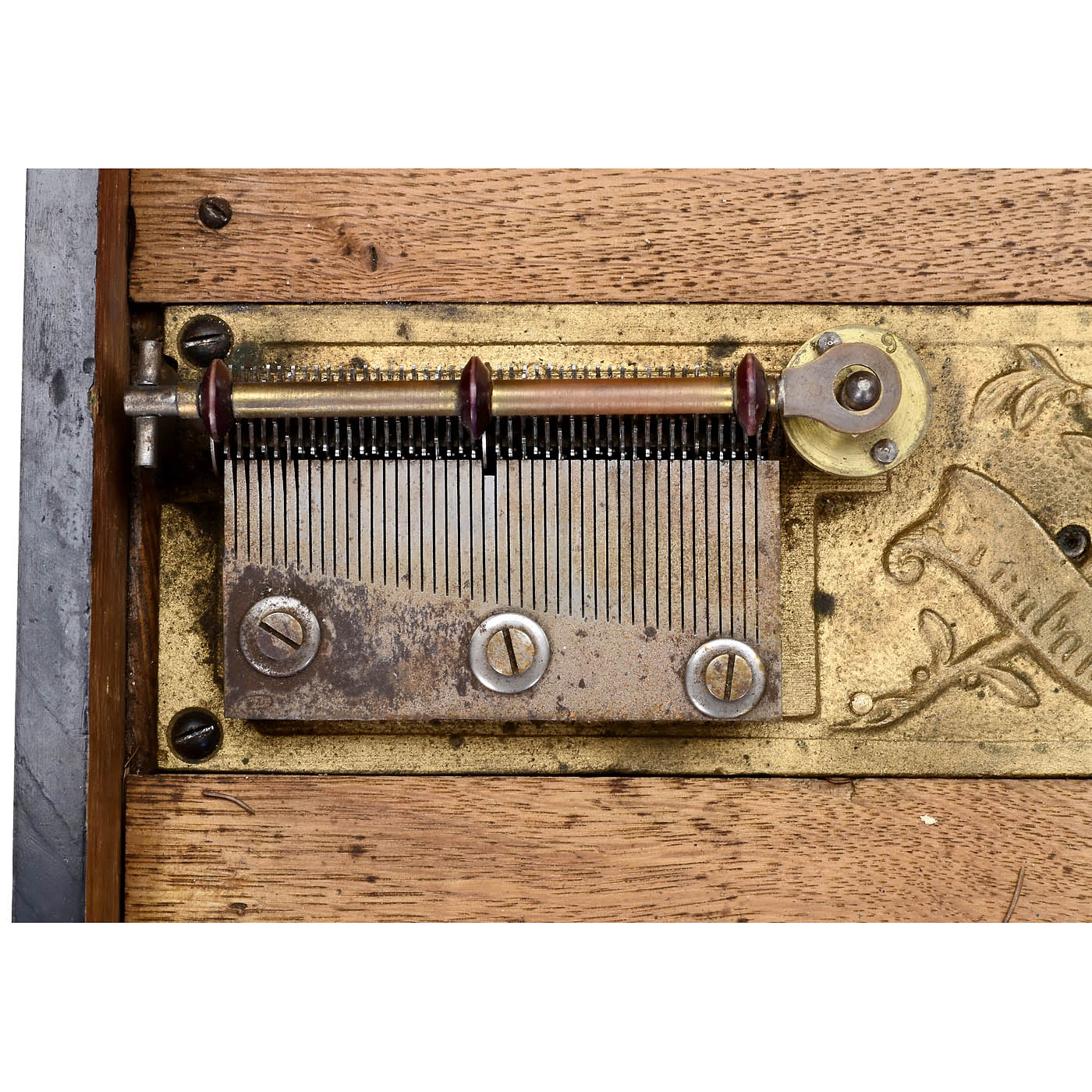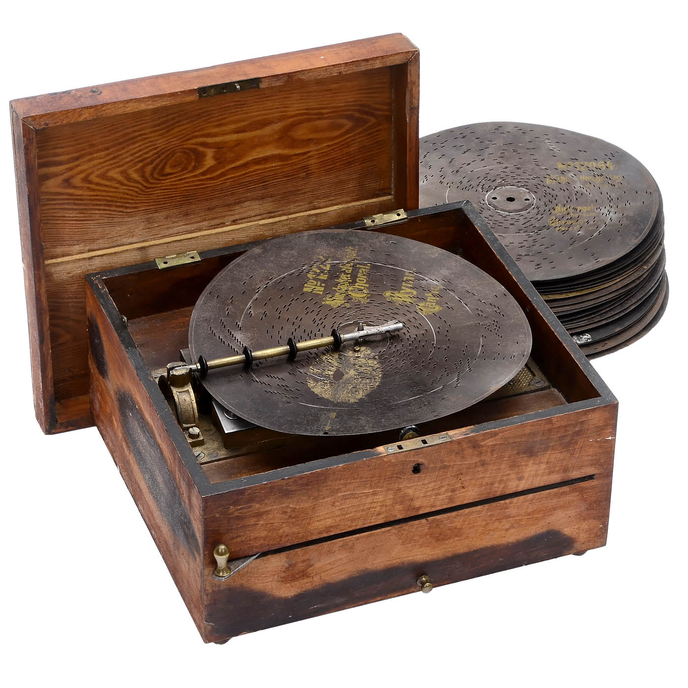 1) Troubadour, Gebrüder Grosz, Leipzig, for Ø 8 7/8 in. discs, 44 teeth in steel comb (complete), working, with 9 discs. - 2) Adler Musikwerke, Leipzig, for Ø 10 ½ in. discs, 61 teeth in two steel combs (complete), not working, case in need of restoration, with 19 discs. - And: 3) Polyphon Musikwerke, Leipzig, for Ø 8 in. discs, 41 teeth in steel comb (complete), working, with 14 discs.