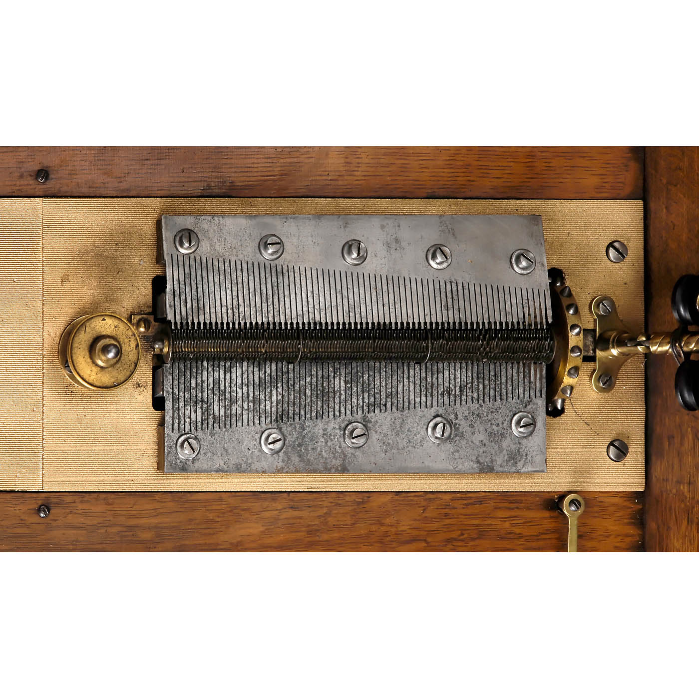 Manufacturer: Regina Music Box Company, New York. For 20 ¾ in. discs, 130 teeth in duplex comb (complete), oak case with four-piece folding casket-lid, size 29 ½ x 21 x 11 ½ in., serial no. 29054. With one disc. Playing condition, steel comb in need of tuning.
