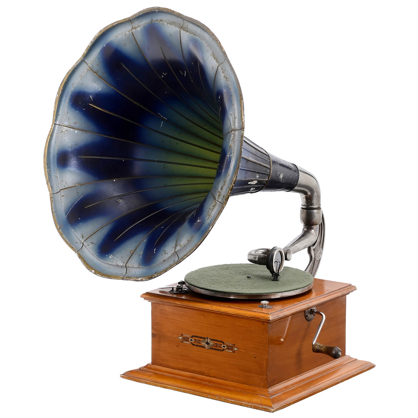 Germany. Light-brown walnut case with decal, "Exposition" mica reproducer, original lacquered tin horn, Ø 19 ½ in., good working condition with excellent sound.
