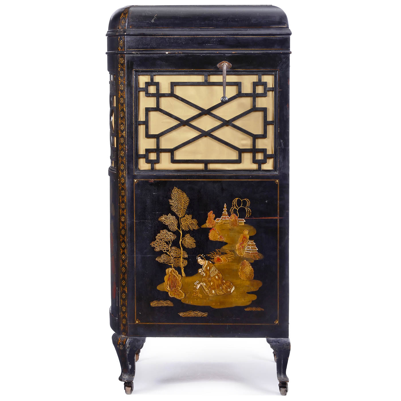 Vox-Schallplatten- und Sprechmaschinen-AG, Berlin. Black polished case, 3 sides and lid with Chinoiserie paintings, Vox wood-mount mica reproducer, working, size 20 ½ x 21 2/3 x 47 in. - Unique, probably made on special request!