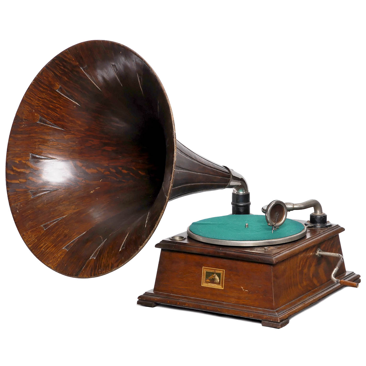 His Master's Voice, England. With decal for Italy "La Voce del Padrone", with 21 ½-inch oak horn and matching case, HMV no. 4 soundbox, 4-spring motor, minor scratches on horn and case, good playing condition. The last horn gramophone model by HMV.