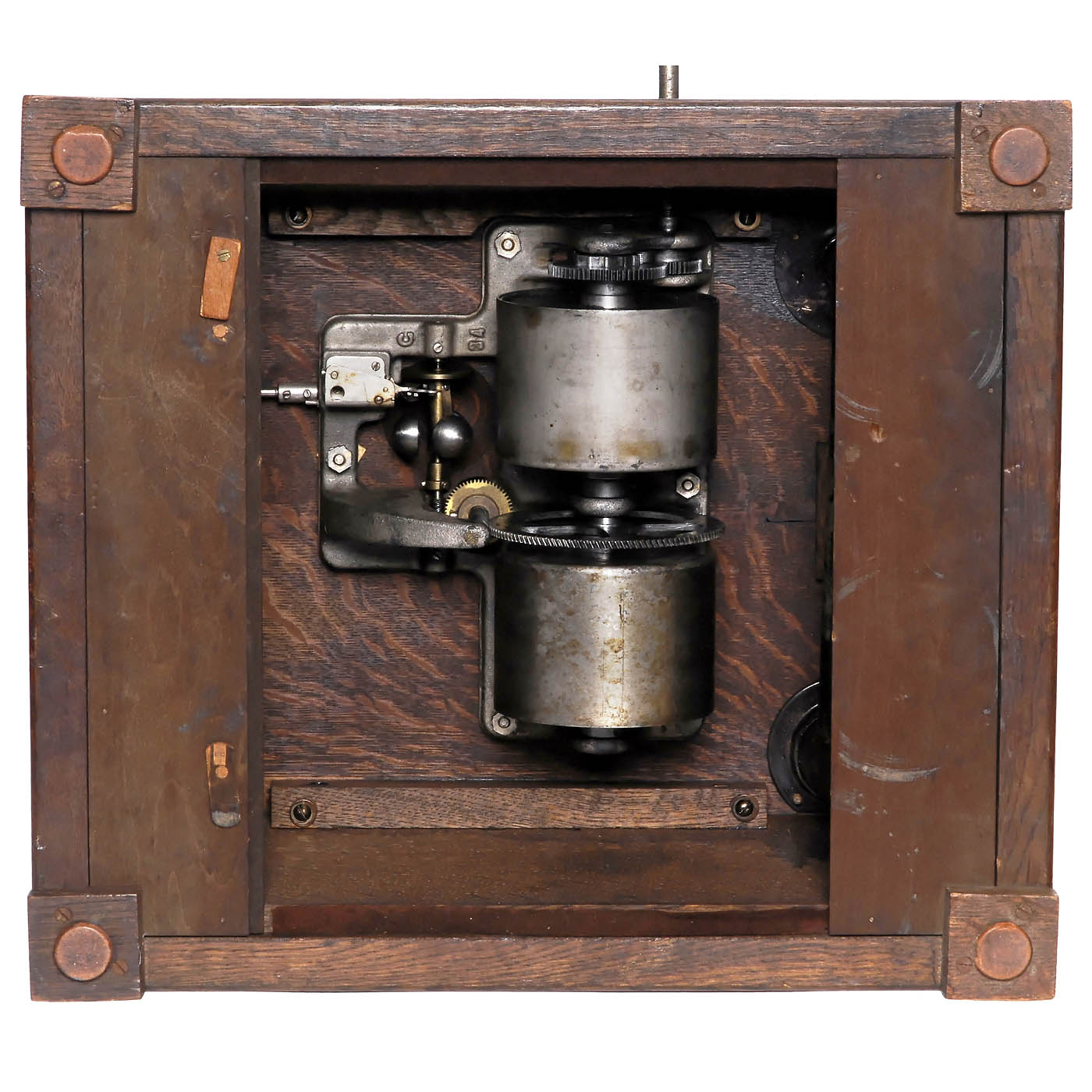 His Master's Voice, England. With decal for Italy "La Voce del Padrone", with 21 ½-inch oak horn and matching case, HMV no. 4 soundbox, 4-spring motor, minor scratches on horn and case, good playing condition. The last horn gramophone model by HMV.