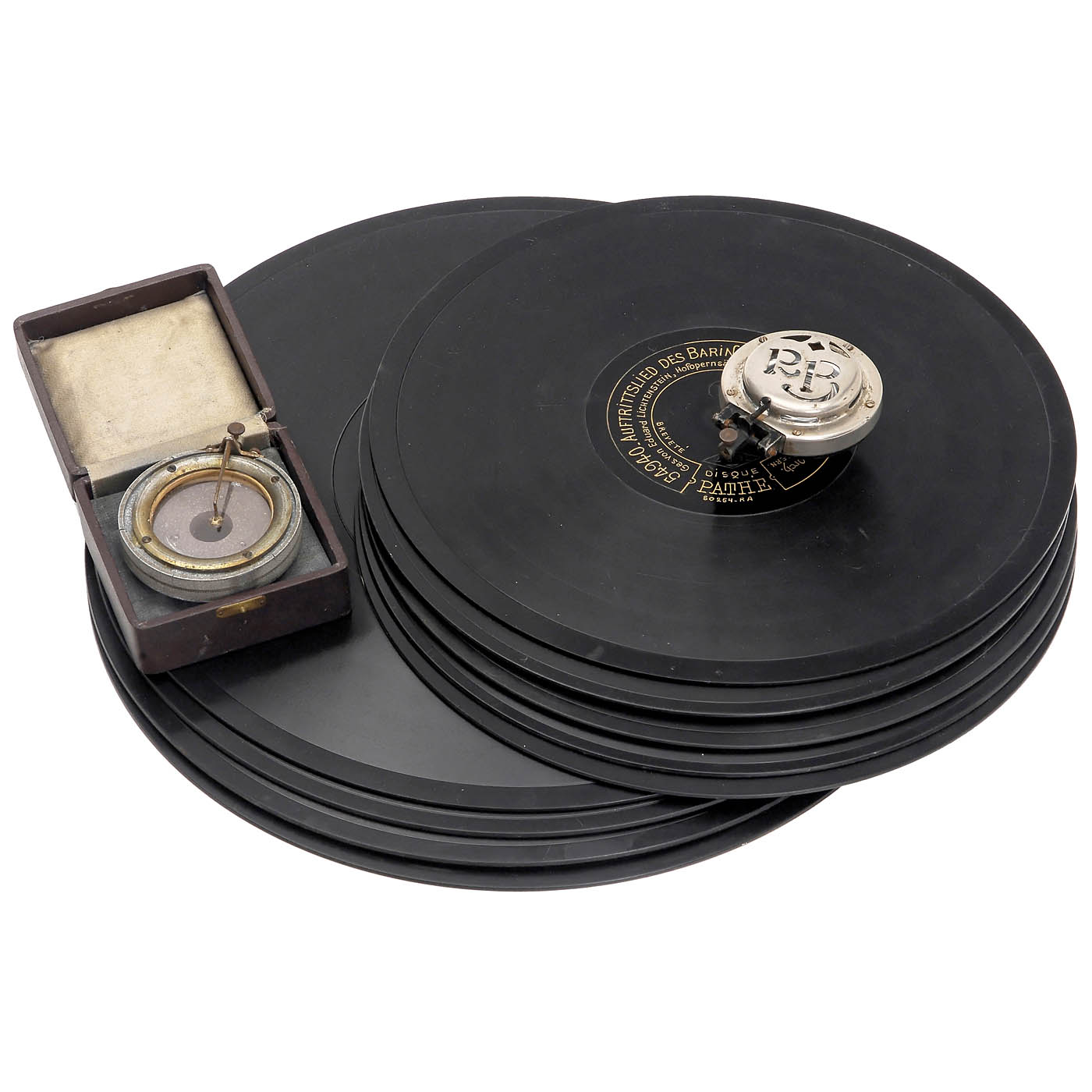 1) Horn gramophone, with Pathé Concert reproducer (without sapphire), spring mechanism works, green metal horn, c. 1915. - 2) 9 Pathé vertically-cut records. - 3) Telefunken "Lido", portable gramophone, with Telefunken mica soundbox, speed controller defective, c. 1938. - 4) 2 reproducers. - And: 5) Emil Berliner Style 3 gramophone, replica from c. 1980, open spring motor (working), with 1 original record, made in Hanover.