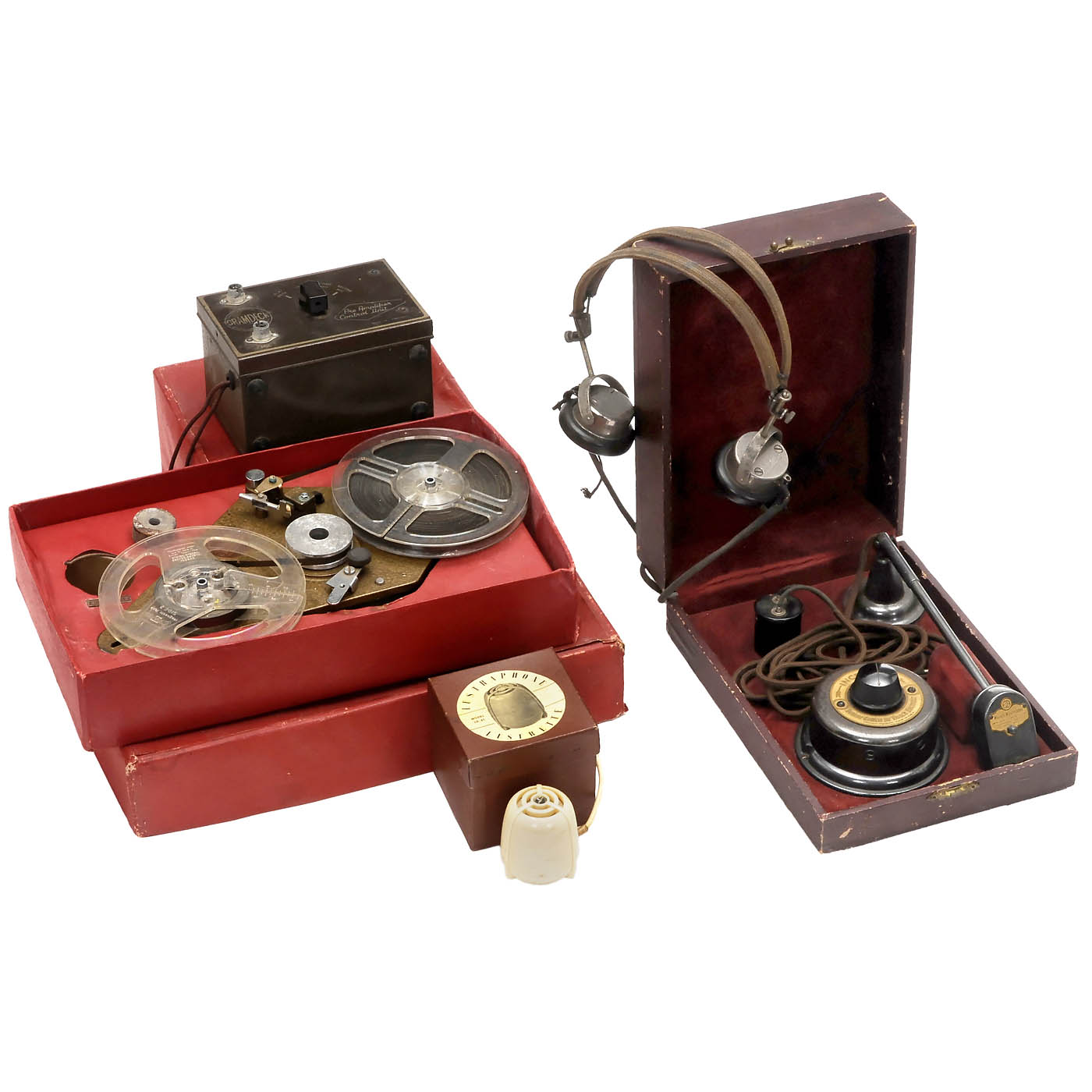 1) Gramdeck, tape recorder attachment for use with a record player, no integrated drive, made by Andrew Merryfield London. With matching pre-amplifier, both in original boxes. Only manufactured for one year. - 2) Western Electric earphone. - 3) Lustraphone Lustrette, model LD/61, small microphone in box. - And: 4) Bosch Recreator, electric pick-up, with volume control, made by American Bosch Magneto Corporation. In box.