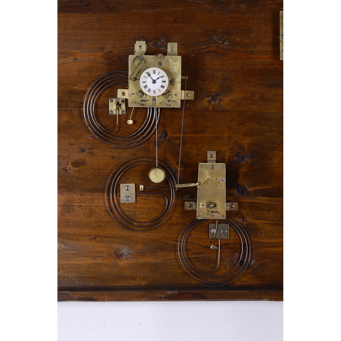 Oil on metal depicting a mountainous landscape with lake and church, with 2½-inch (6,3 cm) enameled Roman dial in tower, two-train movement striking hours and halves on gong, Angelus movement striking on two goings and large independent cylinder musical movement by Ducommun-Girod, no. 20187, playing six airs, in giltwood and gesso frame, 39 x 47 in. (99 x 119 cm), cylinder 10 ½ in. (26,5 cm), without keys. Condition: Clock running, accuracy not guaranteed, dial probably replaced, some retouch on painting, not black-lighted, scattered repairs and partial refinish on frame, cylinder movement has been cleaned and is in good playing condition. A large and impressive picture clock.
