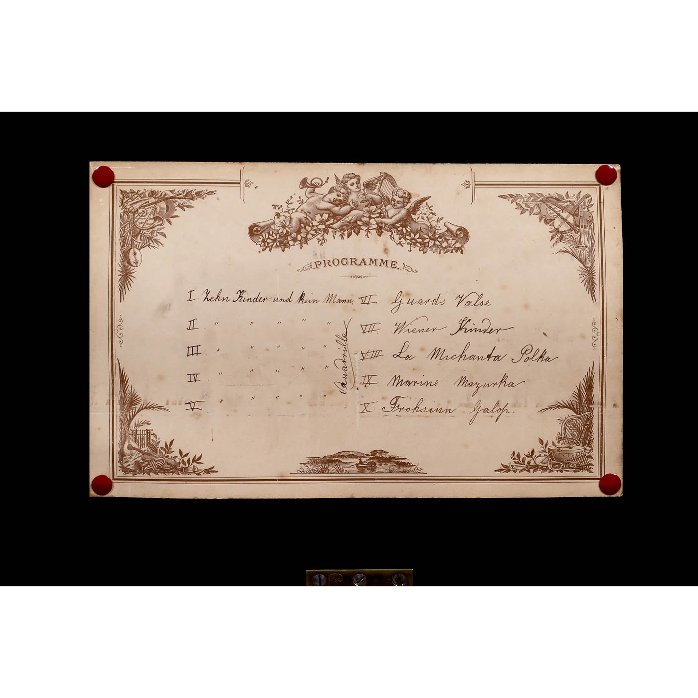 Probably Bremond or Ducommun-Girod. No. 5895, playing the quadrille "Zehn Kinder und kein Mann" ("Ten Children and No Husband") in five parts and five other dance airs accompanied by optional percussion: drum, six bells and castanet mounted beneath the bedplate, with 93 teeth in the musical and 22 teeth in the percussion combs (all four combs complete, approx. four musical teeth neatly replaced), flat-topped winding lever, original tune-sheet and book-matched walnut-veneered case with carved sound fret, boxwood stringing and kingwood banding, wd. 31 in. (79 cm), cylinder 19 in. (48.5 cm), movement and case in good restored condition.