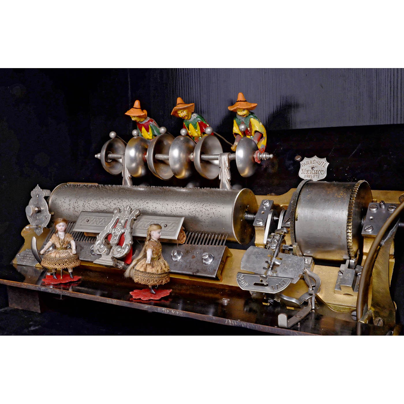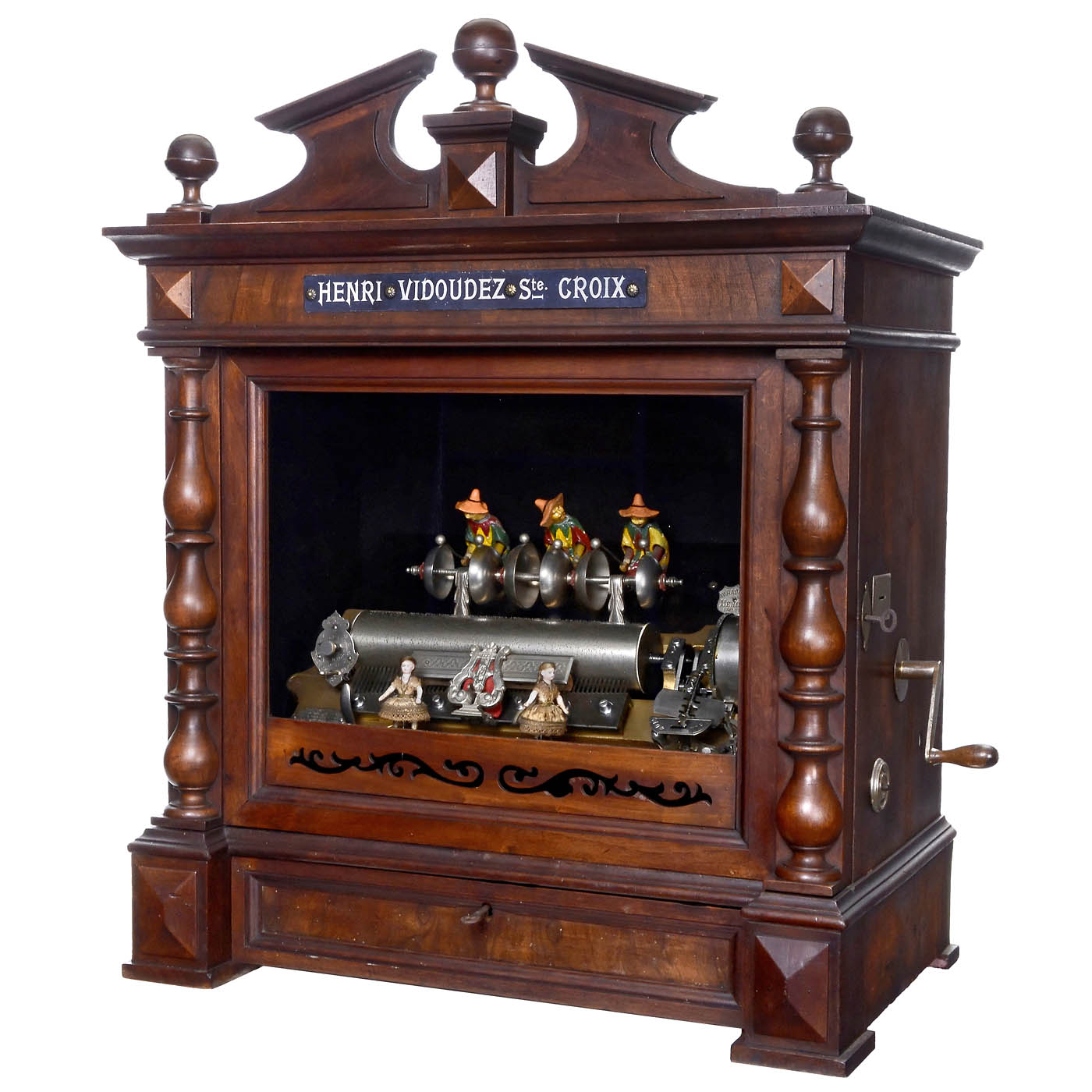 No. 113378, playing 10 airs accompanied by 2 dancing dolls and 3 polychrome Mandarin automata striking 6 optional bells, 62 teeth in comb (complete), coin-activated crank-wound nickel-plated movement, tune-selector, parachute safety check, in walnut case with coin drawer, sound frets, pediment with turned finials and embossed card plaque of "Henri Vidoudez, Ste. Croix", wd. 26 x dp. 15 x ht. 32 1/3 in. (66 x 38 x 82 cm), with crank and cabinet key. Playing condition, case refinished. - A rare example of a station musical box!