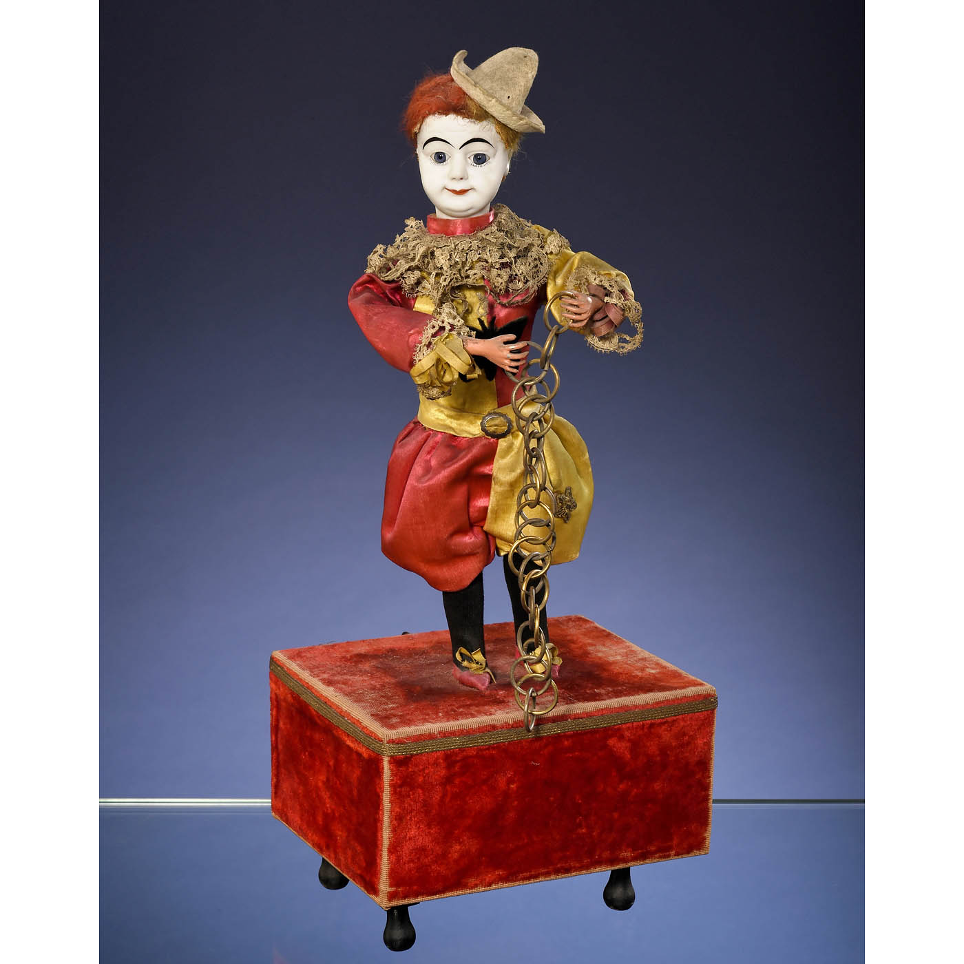 With unmarked Simon & Halbig bisque character head, closed smiling mouth, fixed blue glass eyes, molded laughter lines, arched brows, original mohair wig (not removed for inspection) and metal hands holding two ends of a linked chain, on velvet-covered ba