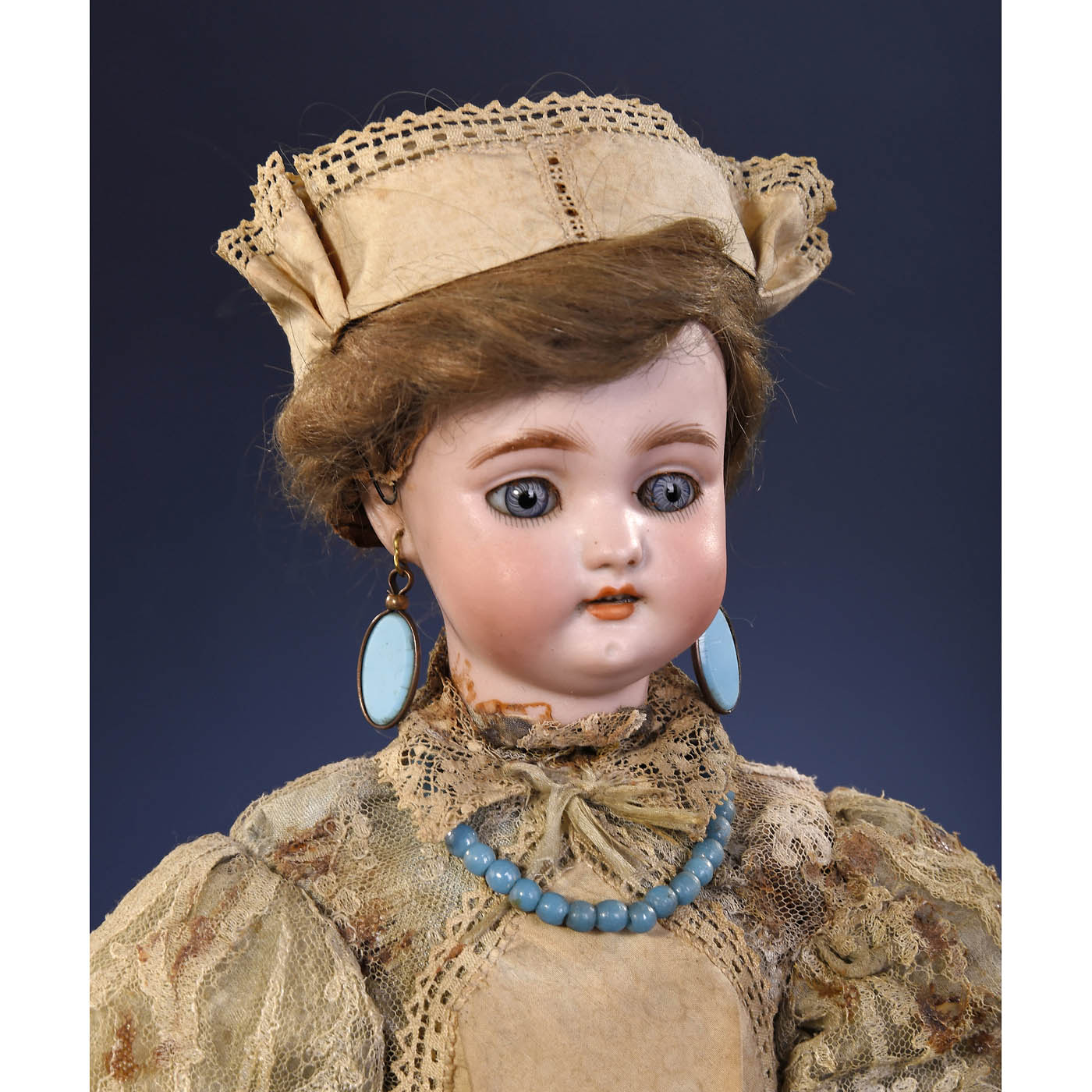 With Simon & Halbig bisque head incised "1300, Simon & Halbig, SH", open mouth, fixed blue glass eyes, pierced ears with earrings, original mohair wig (not removed for inspection), papier-mâché hands, torso containing open-spring motor causing nurse to nod her head as she rocks a bisque baby back and forth in his woven wicker cradle, wearing original lace and cotton costume, on velvet-covered base with independent single-air cylinder musical movement, ht. figure 13 ¾ in. (35 cm), total 16 ½ in. (42 cm), hands repainted, base not opened for inspection, unrestored working and playing condition. With cast-steel "RD" key. - A delightful Roullet et Decamps automaton with childhood theme, original costume and accessories. - Provenance: Collection of José Mario Armero.