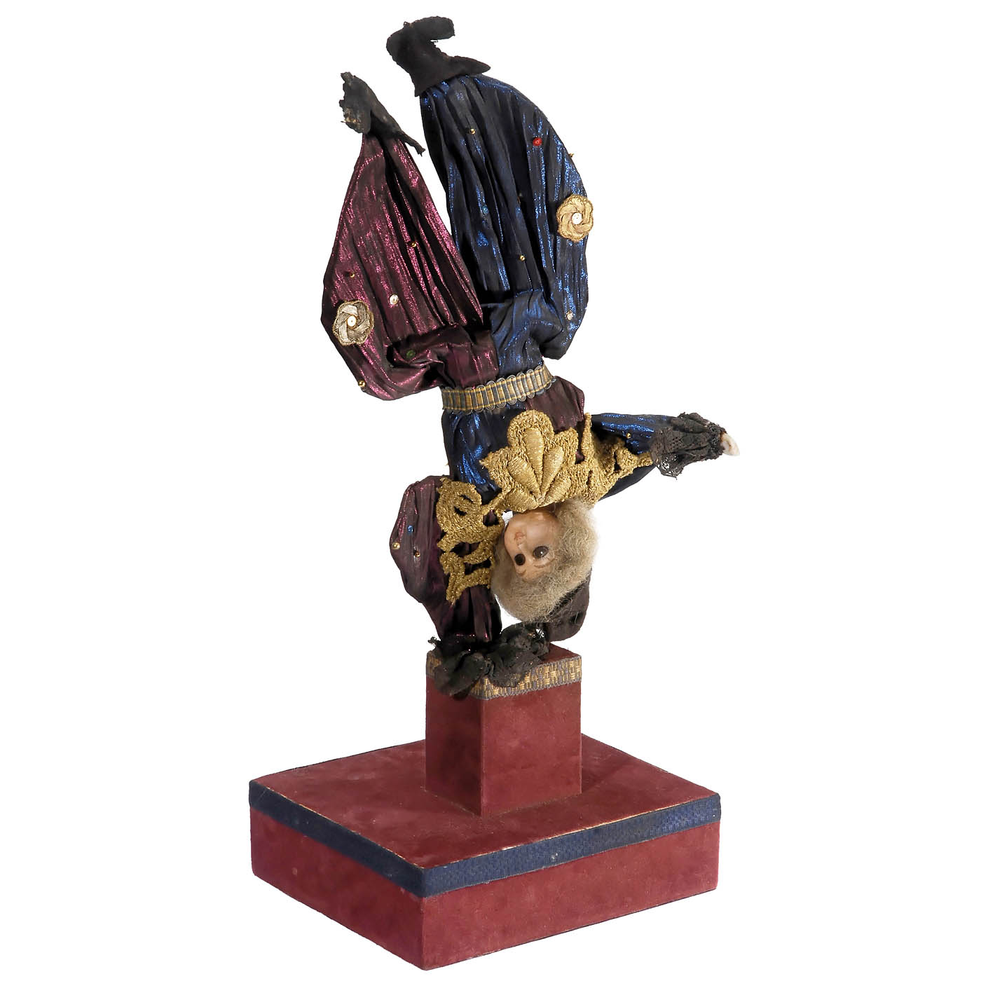 With bisque head and hands, balancing on a block on velvet-covered base, a small 2-air cylinder musical movement ("The Blue Danube" and "Vienna Life" by J. Strauss) causing the figure to perform a handstand while he turns slightly to the side, moves his head, one arm and stretches his legs upwards. In imaginative circus costume with his braids and sequins. Overall height (in handstand): 17 ¾ in. (45 cm).