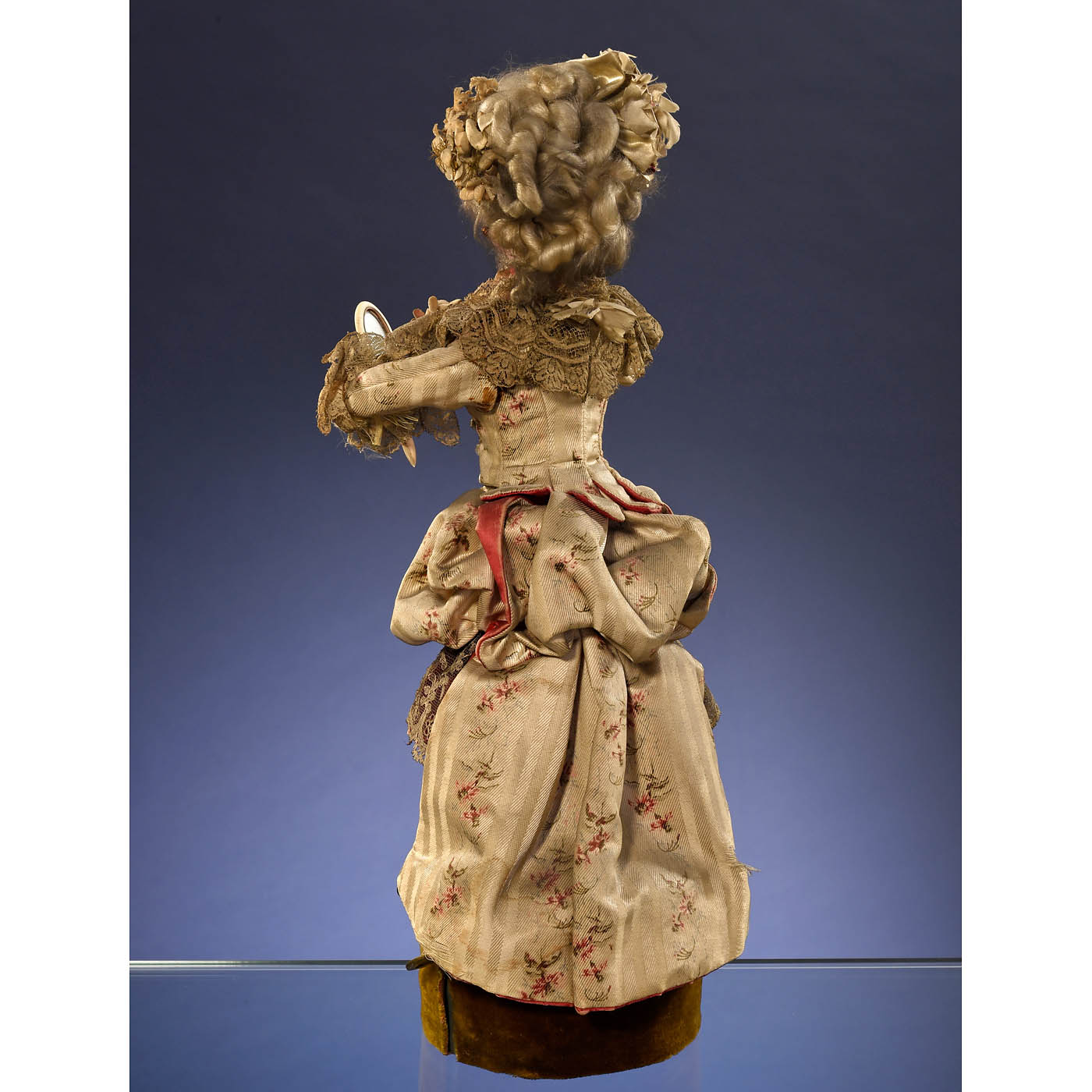 With unmarked Jumeau bisque head, closed mouth, fixed cornflower-blue threaded glass eyes, pierced ears with earrings, original dressed mohair wig in elaborate chignon (not removed for inspection), slender papier-mâché body with bisque shoulder plate and hands holding bone-handled mirror and a swansdown powder puff, on circular velvet-covered base containing three-cam going-barrel motor and cylinder movement playing two airs on one revolution as the lady turns and gently inclines her head, applies powder and raises her mirror to admire the result, dressed in original satin costume with lace-trimmed floral silk bodice and trained overskirt, ht. 18 in. (46 cm), left arm inactive, otherwise good unrestored working and playing condition. With factory brass key and tune-sheet marked "Jouet d'Enfant, H.M." - A well-preserved automaton from the first years of the firm's production, with refined couturier costume from the atelier of Eugénie Bourgeois Lambert.