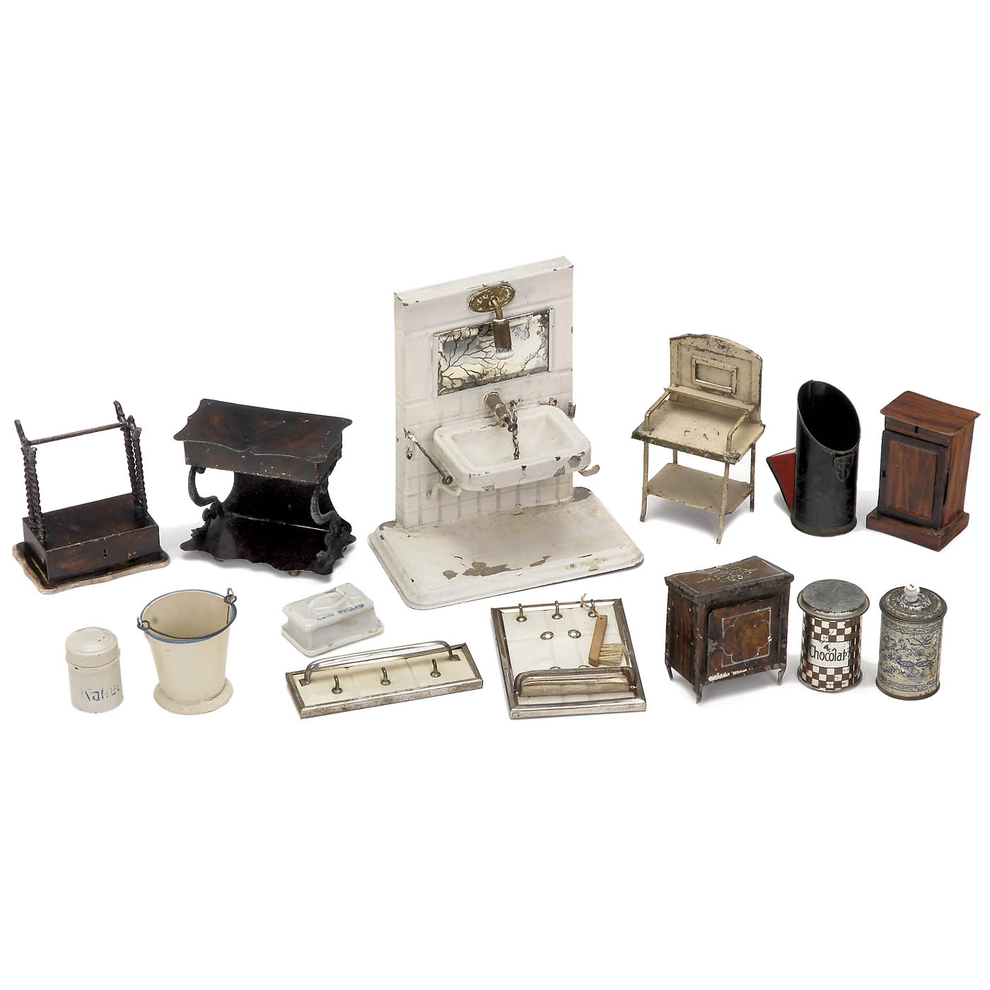 1) Rock & Graner. Sewing table, vanity and 2 bedside cabinets. - 2) 3 cans for chocolate and coffee. - 3) Mühlhauser, Vienna. Wash basin with running water and electric lamp. - 4) Porcelain bowl with lid for hot sausages. - 5) 2 wall panels for towels. - And: 6) Vanity, bucket and coal chute.