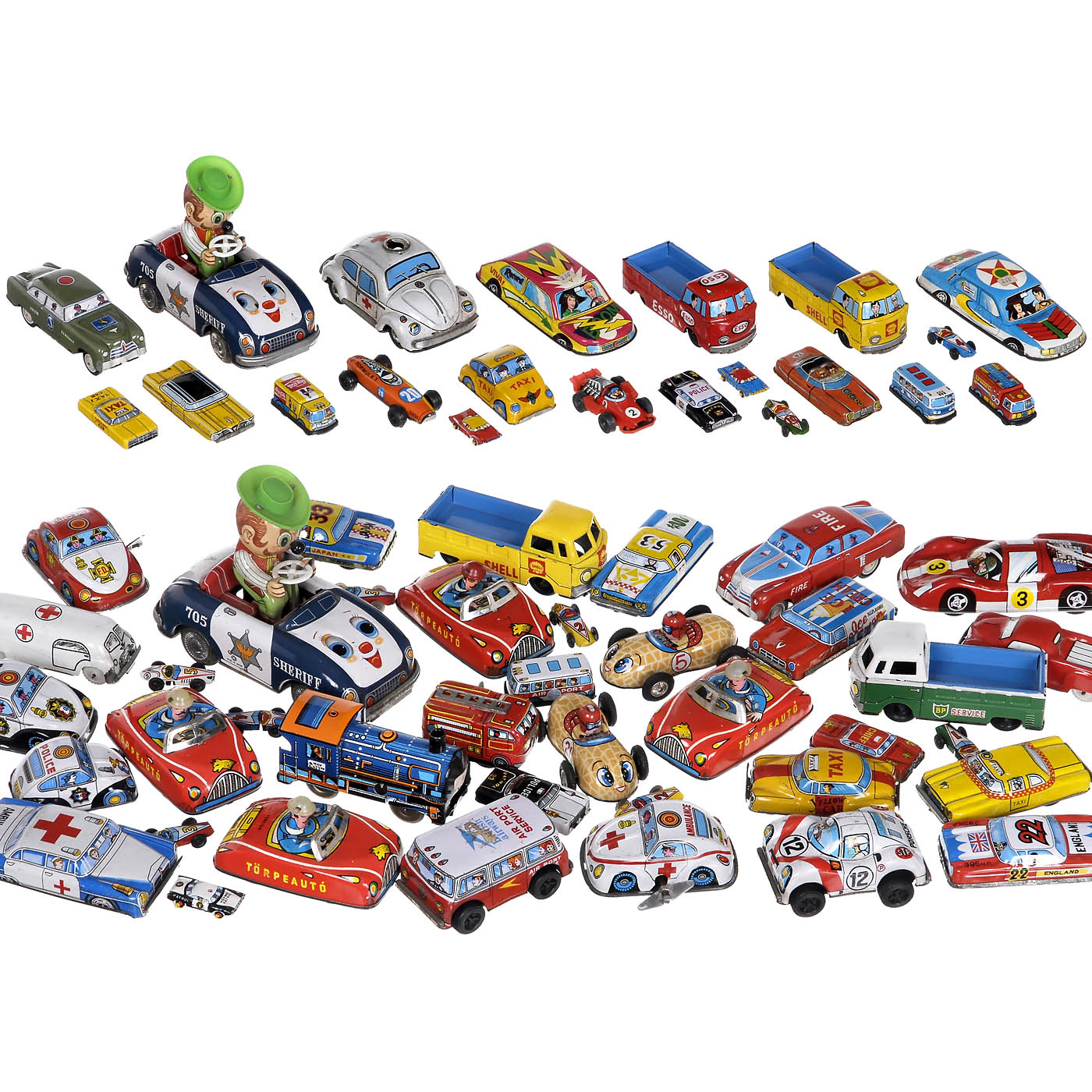 Lithographed tin with plastic parts, spring-driven, friction-driven or without motor, mostly made in Japan, length between 1 ¼ and 6 in.