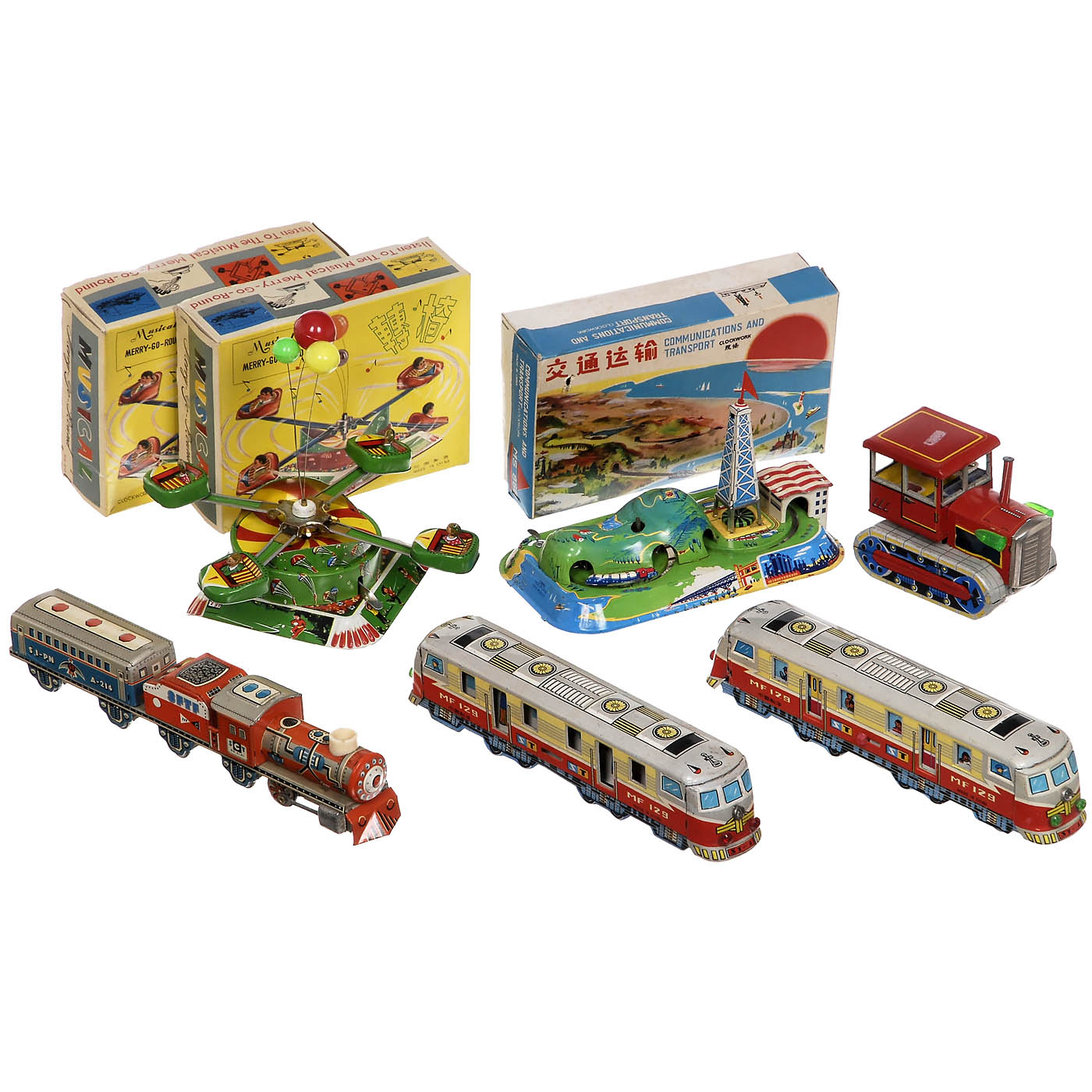 Lithographed tin with plastic parts, mostly spring-driven, including merry-go-rounds, jumping animals, railways, cars, fishes, ice cream vendors, cats with barrows, birds and much more. Not all drives tested.
