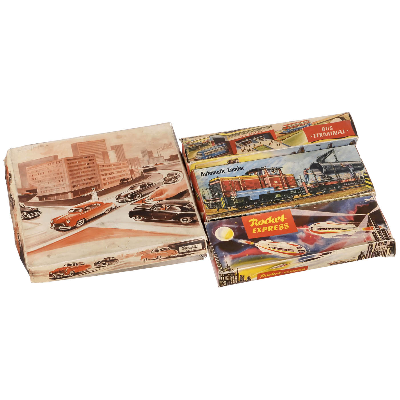 Germany, lithographed tin. 1) Toboggan, no. 290, no vehicles, with box (with damage). - 2) Shunting Track, no. 275, locomotive and trailer, working, with key and box. - 3) Rocket Express, no. 286, spring defective, with two racing cars and box. - 4) Automatic Loader, no. 297, with locomotive, spring defective, no cargo, with box. - 5) Service Station, no. 249, with two racing cars, working, with box. - 6) 2 x Mountain Express, no. 270, with two trains (defective), one with box. - 7) Traffic Crossing (pre-war version), no. 239, with 2 cars, spring drives working, used condition. - 8) Dolomiten Express, no. 280, with vehicle, spring-driven (defective), with box. - 9) Bus Terminal, no. 285, with double-decker bus, spring defective, with box. - 10) Motorway Cross, no. 269, with 2 cars, 1 working, one spring defective, with box. - And: 11) Tracks.