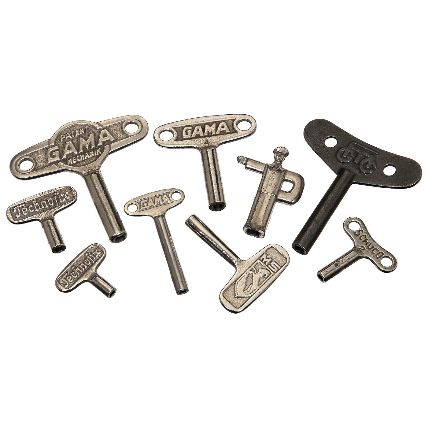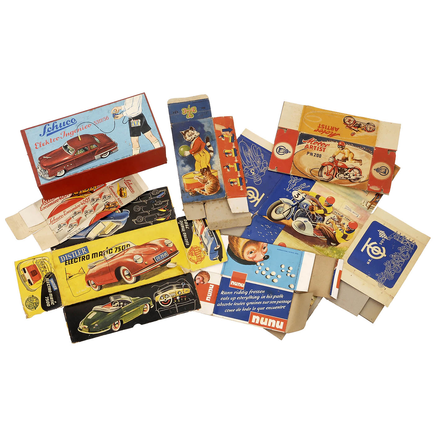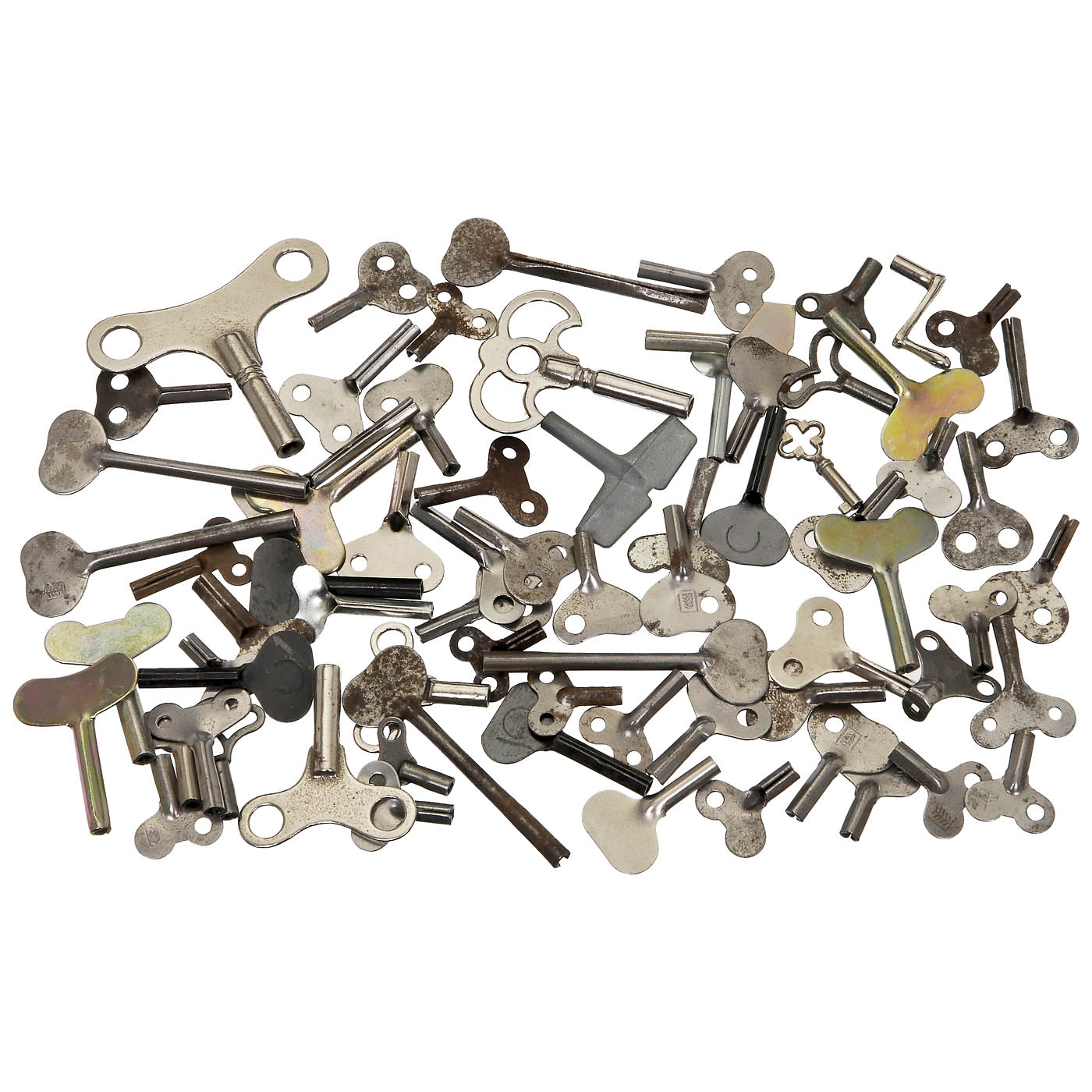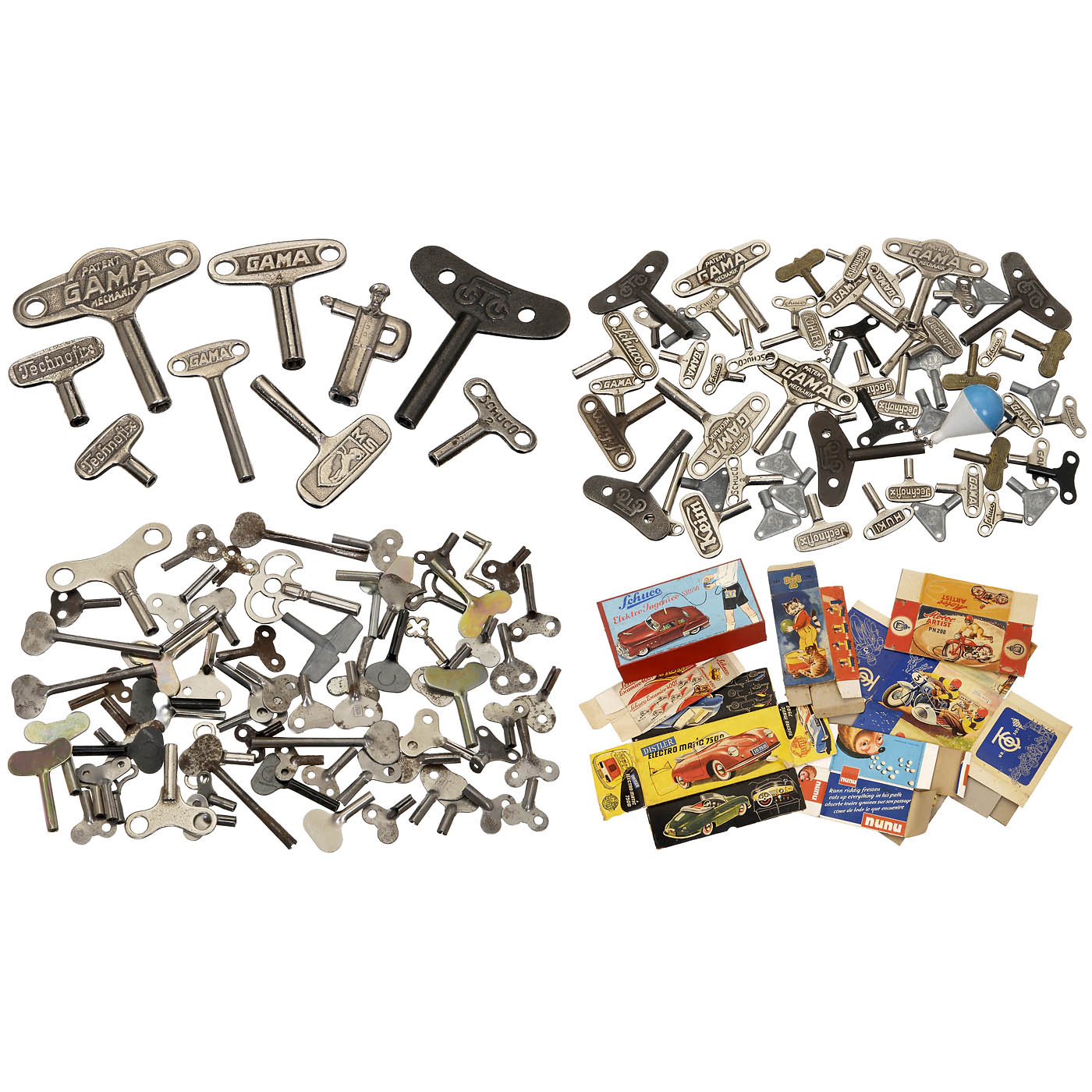 1) 69 keys by Märklin, Prämeta, Technofix, Schuco, Gama, Keim, Köhler and other makers. - 2) 70 keys without maker’s mark. - And: 3) Original boxes: Schuco Examico 4001 - Johann Höfler, no. 131, mechanical cat - Schuco Elektro Ingenico 5311/56 (lid only) - Philipp Niedermeier, no. PN 200, Motor Artist - Distler Electro Magic 7500 (in need of repair) - Lehmann, Nunu 936 - Tippco, Silver Racer, no. 595 (in need of stapling).