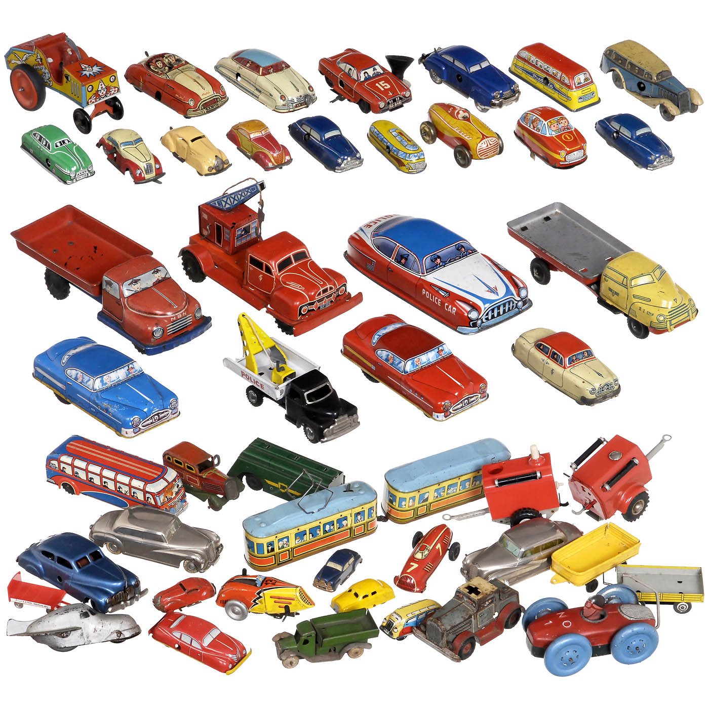 1) 16 spring-driven cars (all working), mostly Germany, manufacturers including: Siegfried Günthermann, Hubert Kienberger and Johann Höfler. - And: 2) 8 vehicles with friction drive (all working), manufacturers including: Philipp Niedermeier, Georg Fischer and NBN. - And: 15 vehicles with missing parts or defective drives, manufacturer: Prämeta, JNF, Georg Fischer, Distler and others. - Also: 2 Gama fire service trailers.