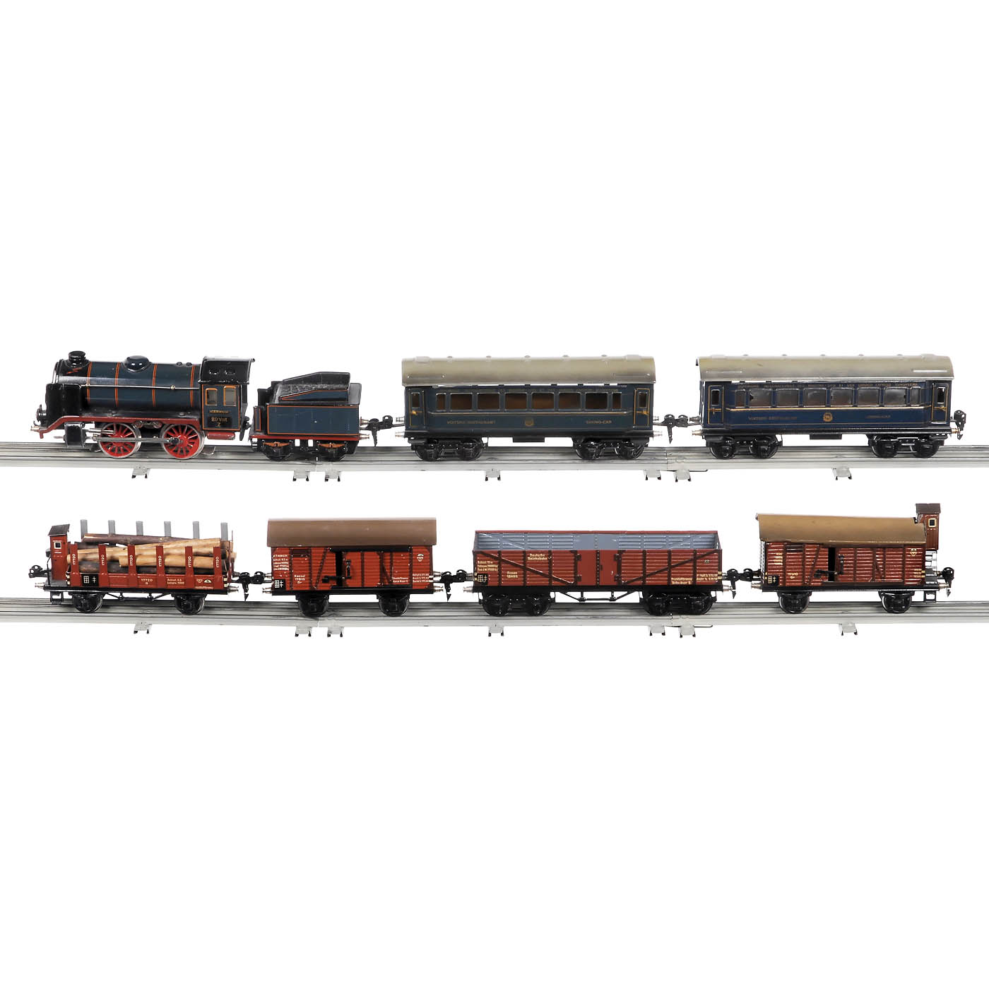 1) Tender steam locomotive R66/12910, 20 volts, length 12 ¼ in., with box. - 2) 2 international dining cars 1756/0, with inscription "Compagnie Internationale des Wagons-Lits et des Grands Express Européens", length 9 ¾ in. each, with boxes. - 3) Closed freight car with raised brakeman's cab 1791/0, length 6 9/10 in. - 4) Closed freight car 1791/0, length 6 ¼ in. - 5) Stake car with brakeman's cab 1772/0 R, with load, length 7 1/3 in. - And: 6) High-board car "Deutsche Reichsbahn", 4-axle, length 9 ½ in. - In addition: 7 straight rails. - All parts in good original condition.