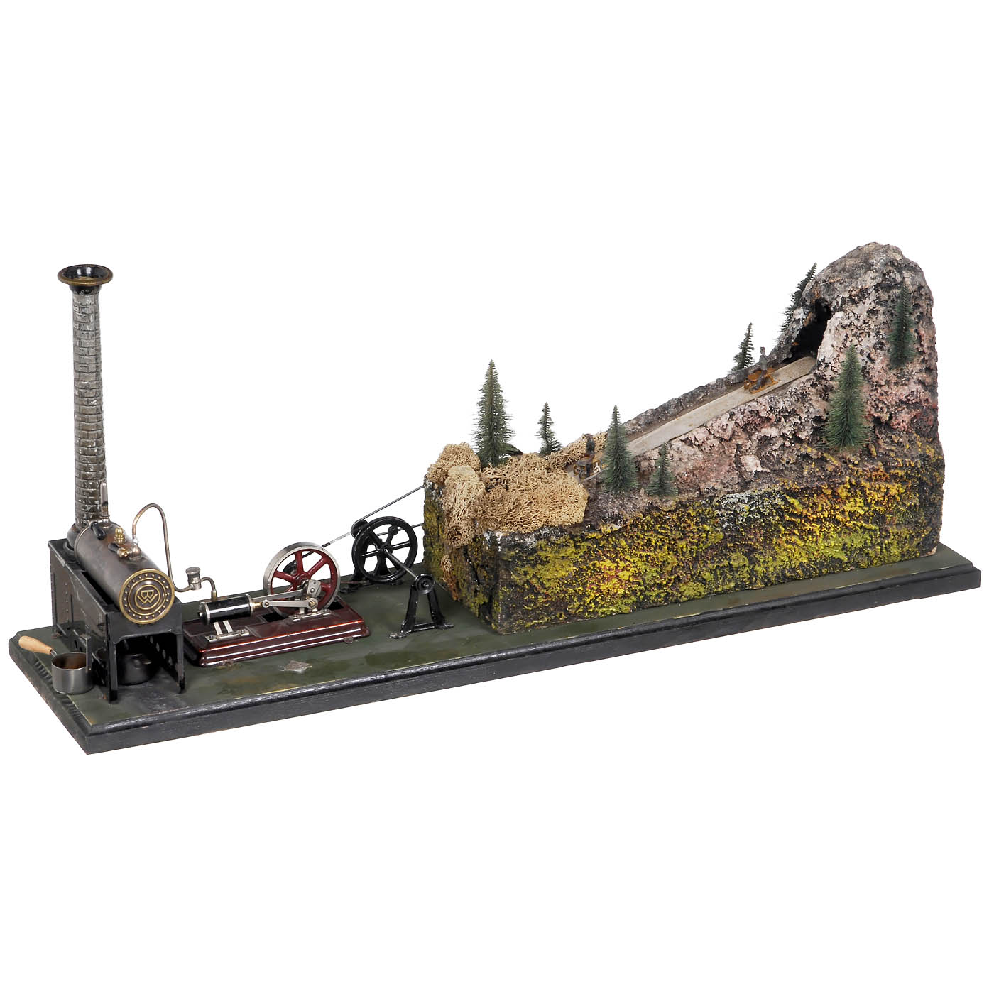Horizontal steam engine by Bing Werke, Nuremberg. With steam motor and transmission, sculpted mountain landscape, belt conveyor with 4 sledge riders, on wood board, overall size 27 ½ x 6 ¾ in. Good working condition.