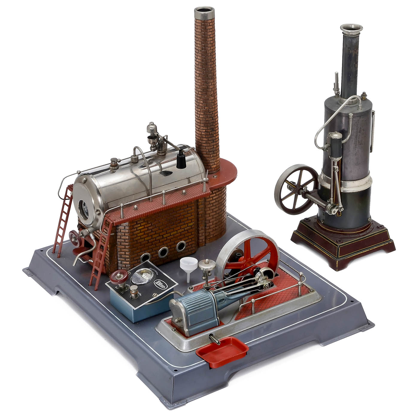 1) Wilesco D24, c. 1985, with manometer, size 16 x 13 x 15 1/3 in. - And: 2) Vertical steam engine, c. 1930, unmarked, fixed cylinder, cast-iron base, no burner, overall height 14 in.