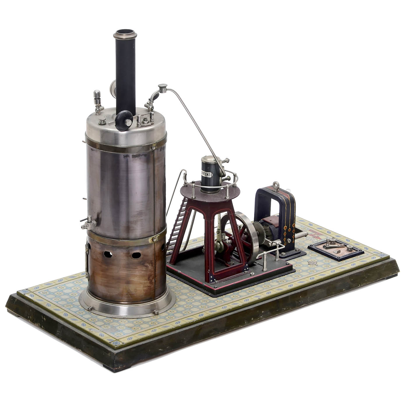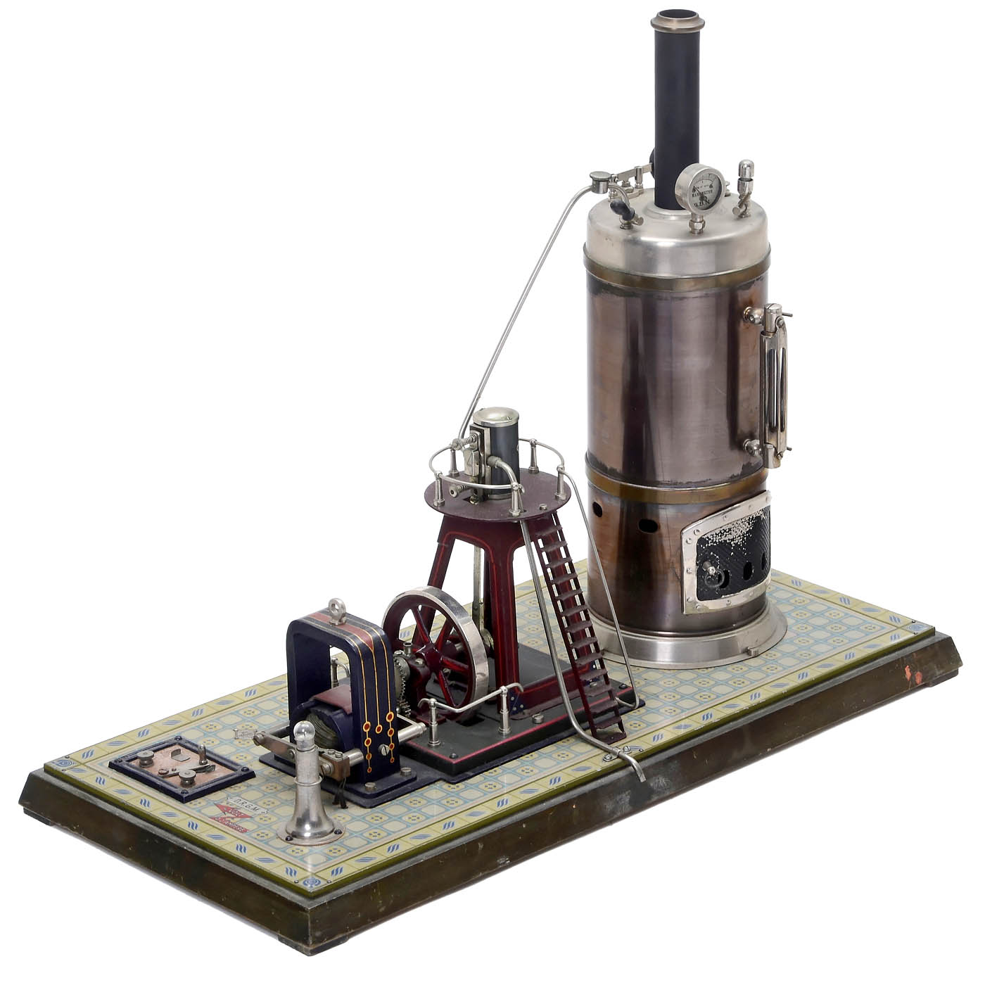 Manufactured by Gebrüder Bing, Nuremberg. Model 130/523, vertical boiler Ø 4 in., oscillating cylinder, tin platform on wood base, overall size 19 1/3 x 9 x 15 2/5 in., missing burner, chimney replaced, complete with all fittings. Very good original condition, including the tiled floor.