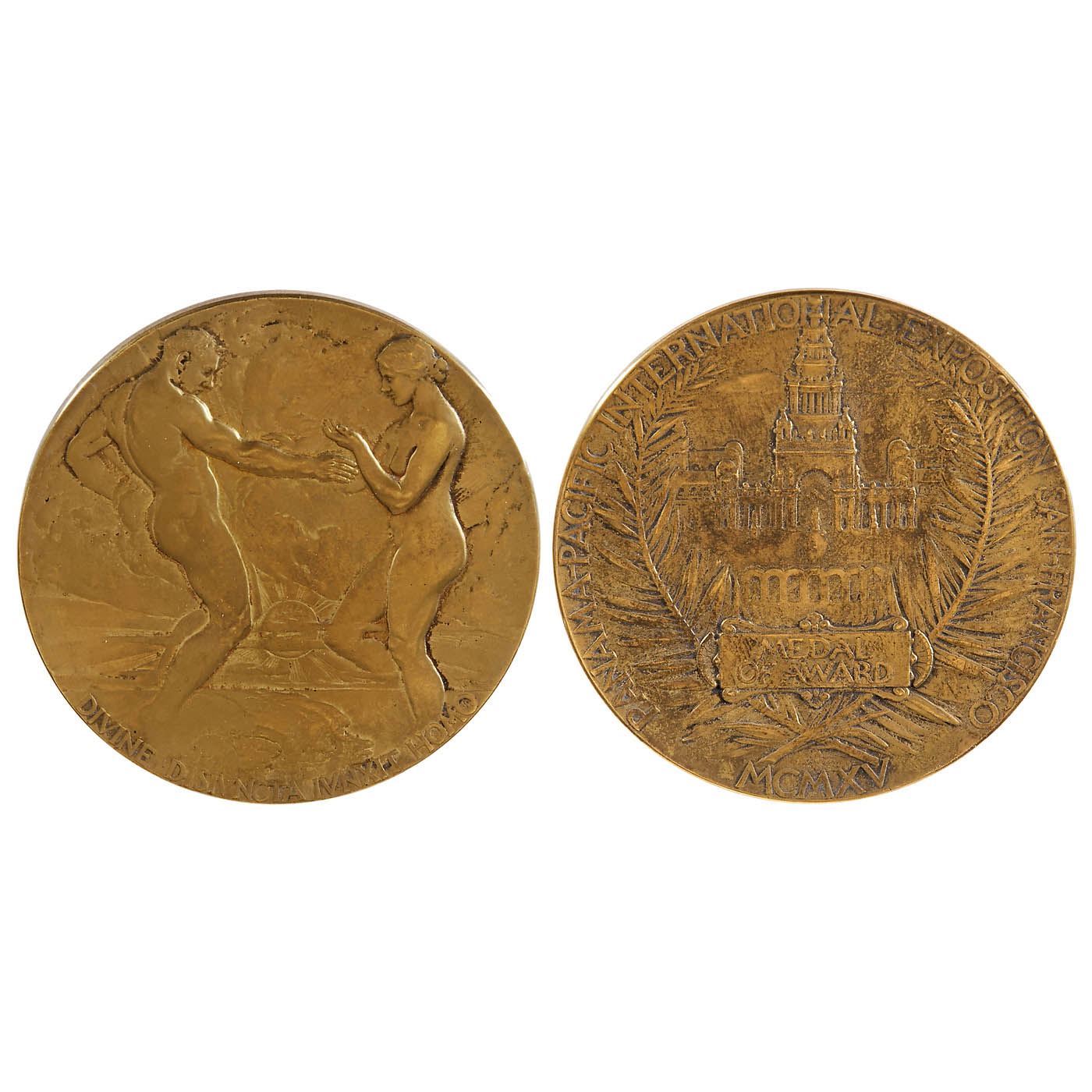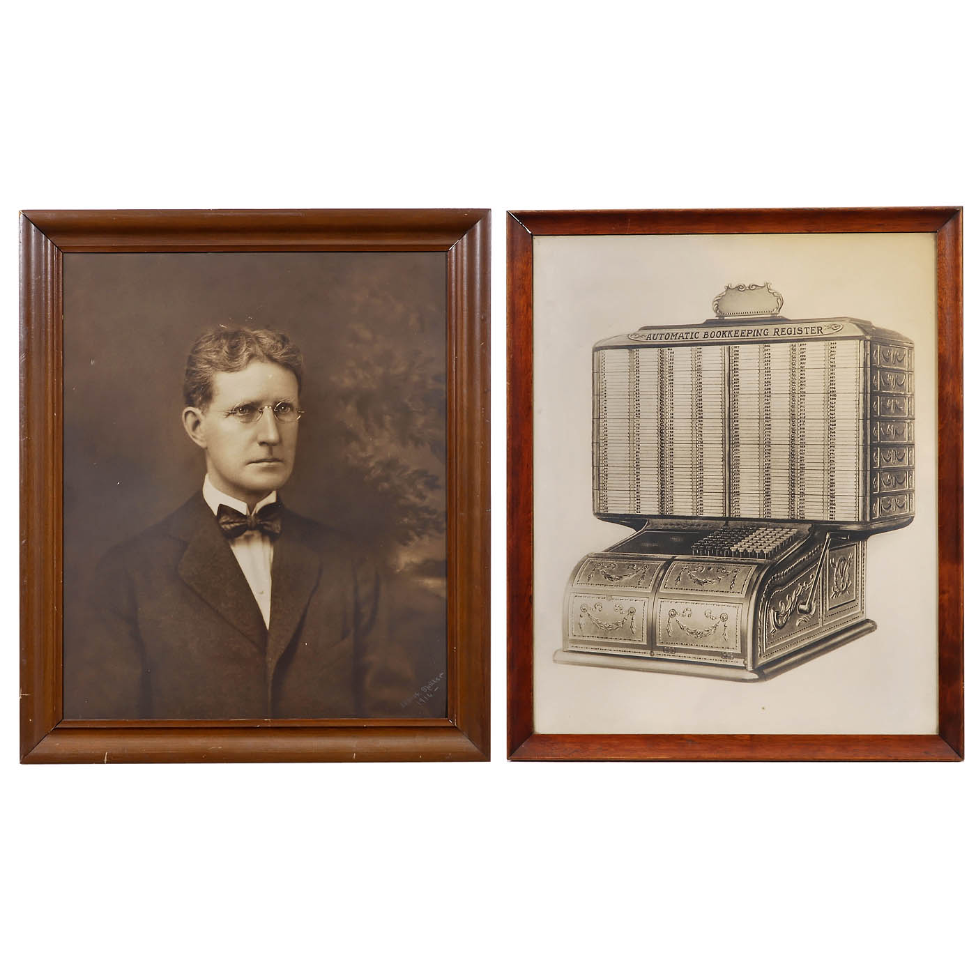 A "one-off" machine that won the Gold Medal at Panama-Pacific International Exposition in San Francisco. Manufactured by The Automatic Bookkeeping Register Company of Kansas City, Missouri, USA. A combination of adding machine, cash register and bookkeeping machine. First patented on March 31, 1908. Ornate bronze case, extended with 5 sections on top, very heavy, weight: 300 pounds. Mechanism sticks, metal panels partially unscrewed. Overall size: 30 ¾ x 22 x 30 ¾ in. - In addition: 1) Original Gold Medal from the Panama-Pacific International Exposition, in case. - 2) Framed certificate of Panama Exposition of 1915 at which the Automatic Bookkeeping Register Company won the Gold Medal. - 3) Framed picture of Frank Laughlin, president of the company. - And: 4) 2 framed pictures of the registers. - A significant document of early office technology.