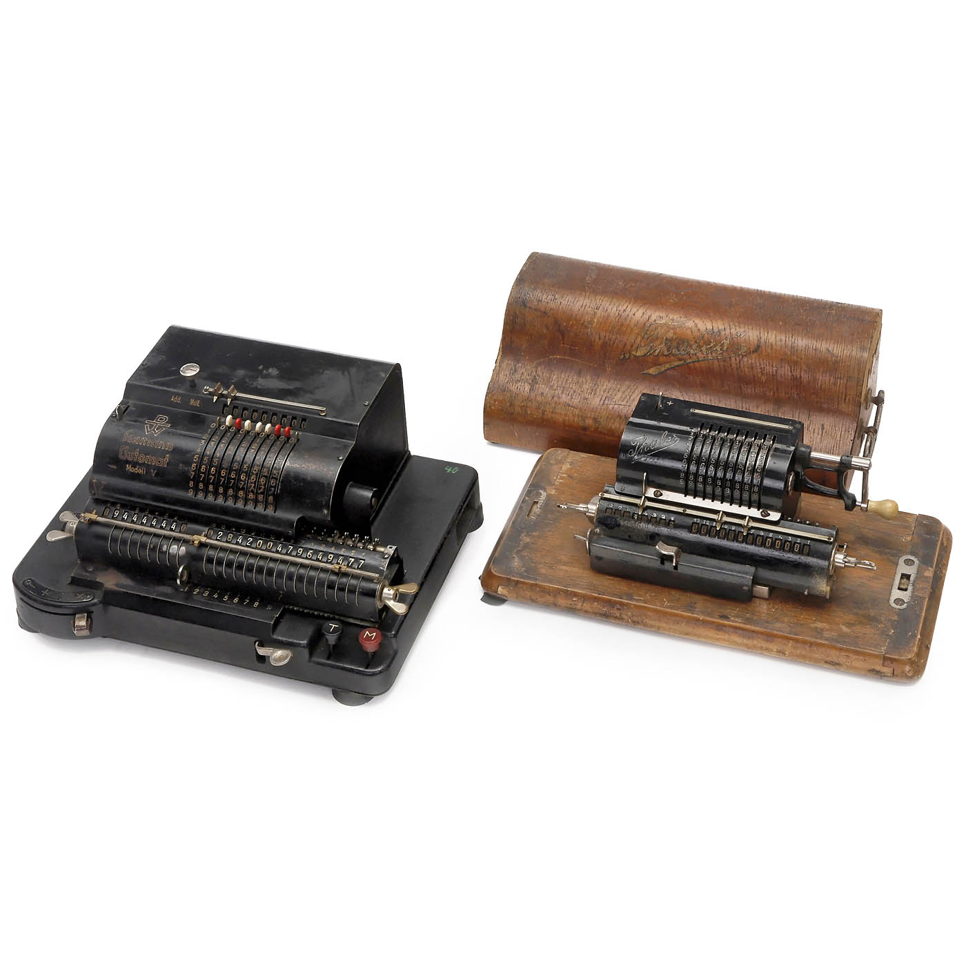 1) "Thales A", c. 1914, spoked-wheel machine, serial no. 10485, 9, 8 and 13 digits, mechanism sticks, with wood cover. (3/4) - 2) "Hamann Automat V", c. 1933, switching latch system, serial no. 4507V, electric motor drive (untested), 9, 9 and 16 digits. (3/-) - 3) "Comptometer Model H", 1920, manufactured by Felt & Tarrent, Chicago. With 8-digit fast adding system and direct drive, serial no. 656332. (2-3/2-3) - 4) "Brunsviga 18 RK", no. 13-48646, Brunswick, 10, 8 and 18 digits, working, c. 1955. (3/2-3) - 5) "Resulta BS 7", c. 1940, manufacturer: Maschinen- und Werkzeugfabrik Paul Brüning, toothed-disk calculating machine, working. (3/2-3) - And: 6) 3 further adding machines and a counter.