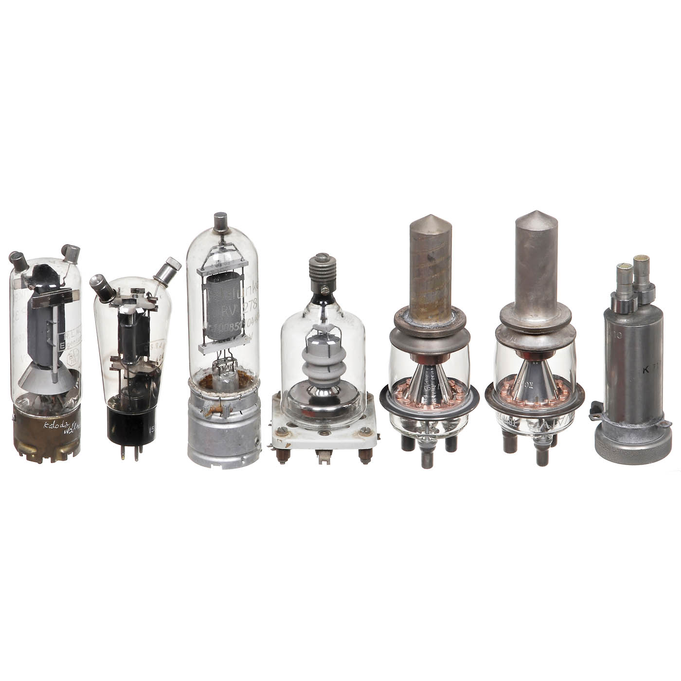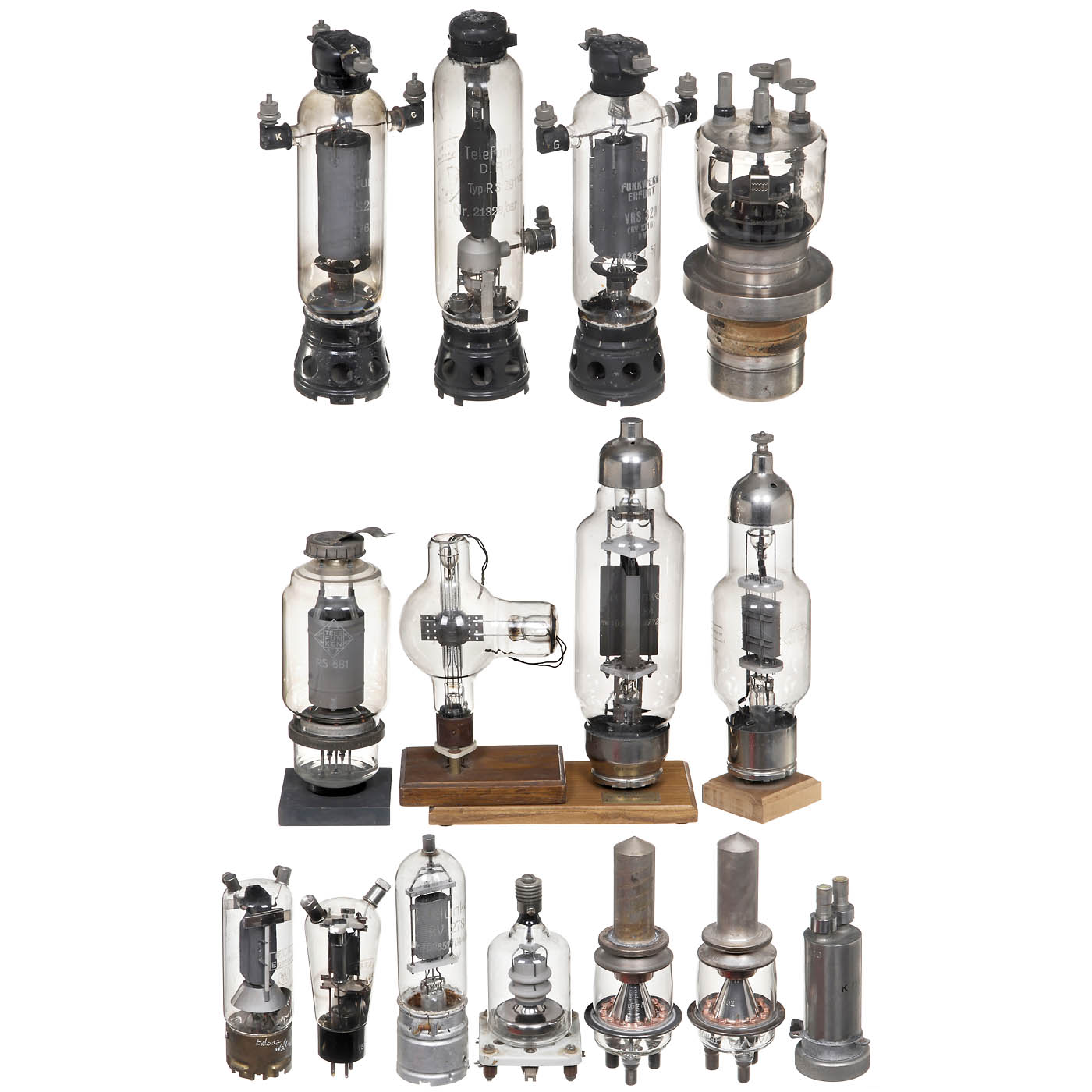 1) Funkwerk Erfurt VRS 320, former Telefunken RV 271B, triode, very rare. - 2) Telefunken RS 291VII, reverse labeled "R.L.M. Eigentum" (Reichsluftfahrtministerium), air-cooled transmitter tetrode. - 3) Telefunken RS 282 (Kriegsmarine), air-cooled transmitter triode. - 4) Telefunken RS 290, transmitter tetrode, with special base and connections. - 5) Telefunken RV 278, air-cooled transmitter triode. - 6) Telefunken RS 283 (Wehrmacht), transmitter triode. - 7) Telefunken RL 12P35, reverse labeled "R.L.M. Eigentum" (Reichsluftfahrtministerium), air-cooled transmitter pentode. - 8) Telefunken RS 284, 600 W transmitter tube. - 9) Siemens RS 1061W, water-cooled triode. - 10) 2 x Valvo TBW 7/8000, water-cooled transmitter tube. - 11) Tungsram DX-10/400, transmitter tube. - And: 12) Siemens RS 1007, 375 W transmitter tube.