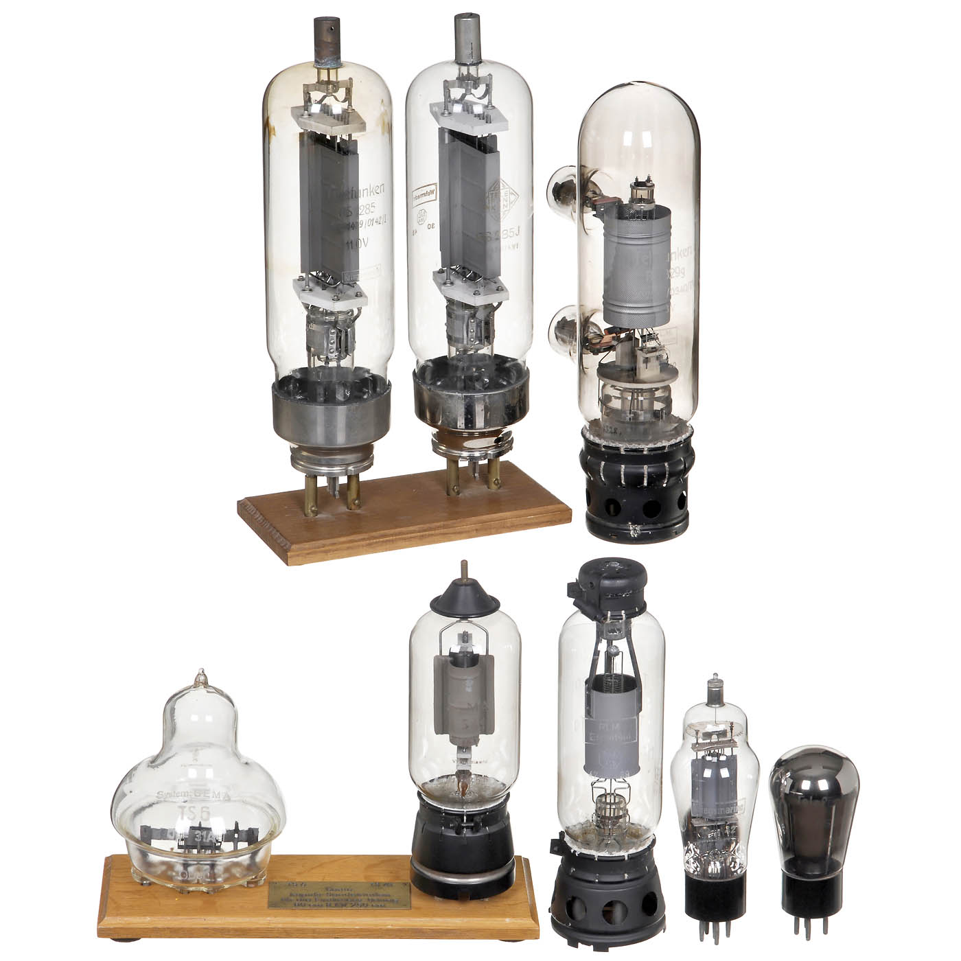 1) Telefunken RS 285, no. 101439/0142/I, Navy, used in Lorenz ground radar, 1938 onwards. - 2) Telefunken RS 285 J, no. 103053/0743/1, Wehrmacht, c. 1940. - 3) Telefunken RS 329g, no. 302518/0340/IV, R.L.M. property (Reich Aviation Ministry), c. 1940. - 4) Gema TS6, onion-shaped all-glass tube for radio location measurement, c. 1938. - 5) Gema TS 41, Wehrmacht, VHF power triode, used in the transmitter of the Freya EW radar, c. 1941. - 6) Telefunken RS 31 IVg, no. 29814/028, Navy, RLM property, c. 1938. - 7) Telefunken RS 242 VII, no. 202565/0540, R.L.M. property (Reich Aviation Ministry), c. 1940. - And: 8) Telefunken RS 289, Navy, c. 1942. - All filaments tested (intact). In 2 military cases.