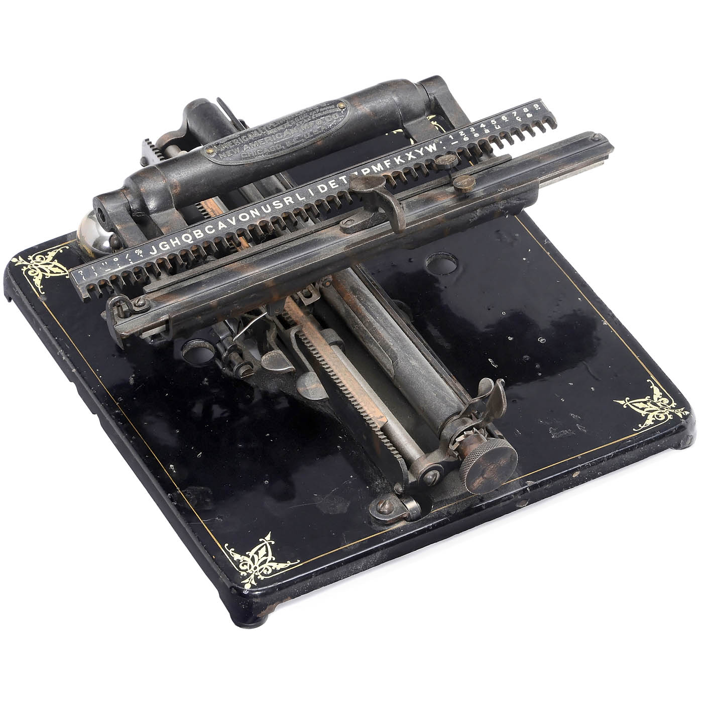 Rare American linear index typewriter with type-rail print element, fabric roller inking, carriage moving at right-angle to the direction of writing, square base. - Literature: Martin, 1949, p. 121. - Hard to find!