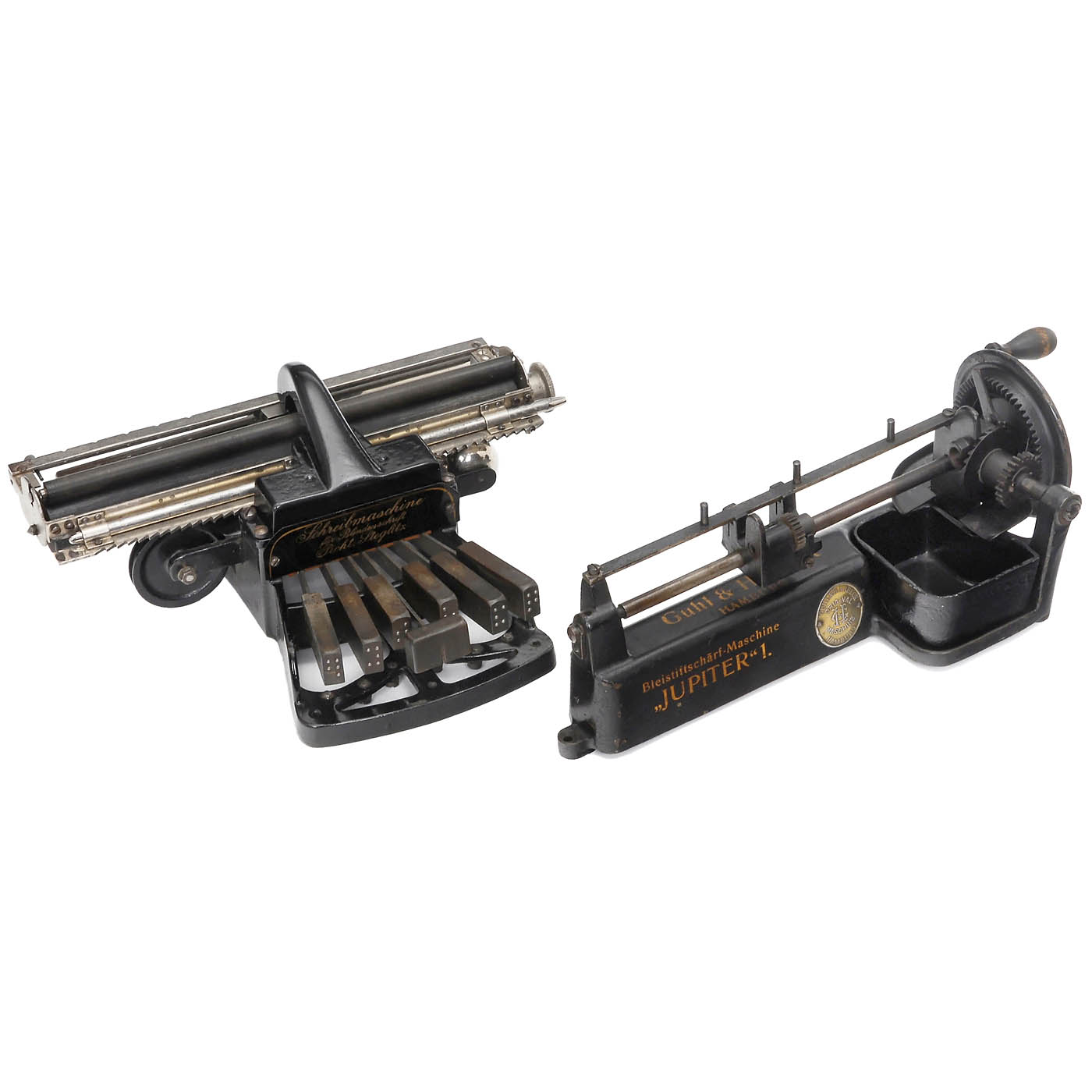 1) Braille blind typewriter by Oskar Picht, Steglitz, in wood case. - And: 2) "Jupiter-1", mechanical pencil sharpener by Guhl & Harbeck, Hamburg, with container.