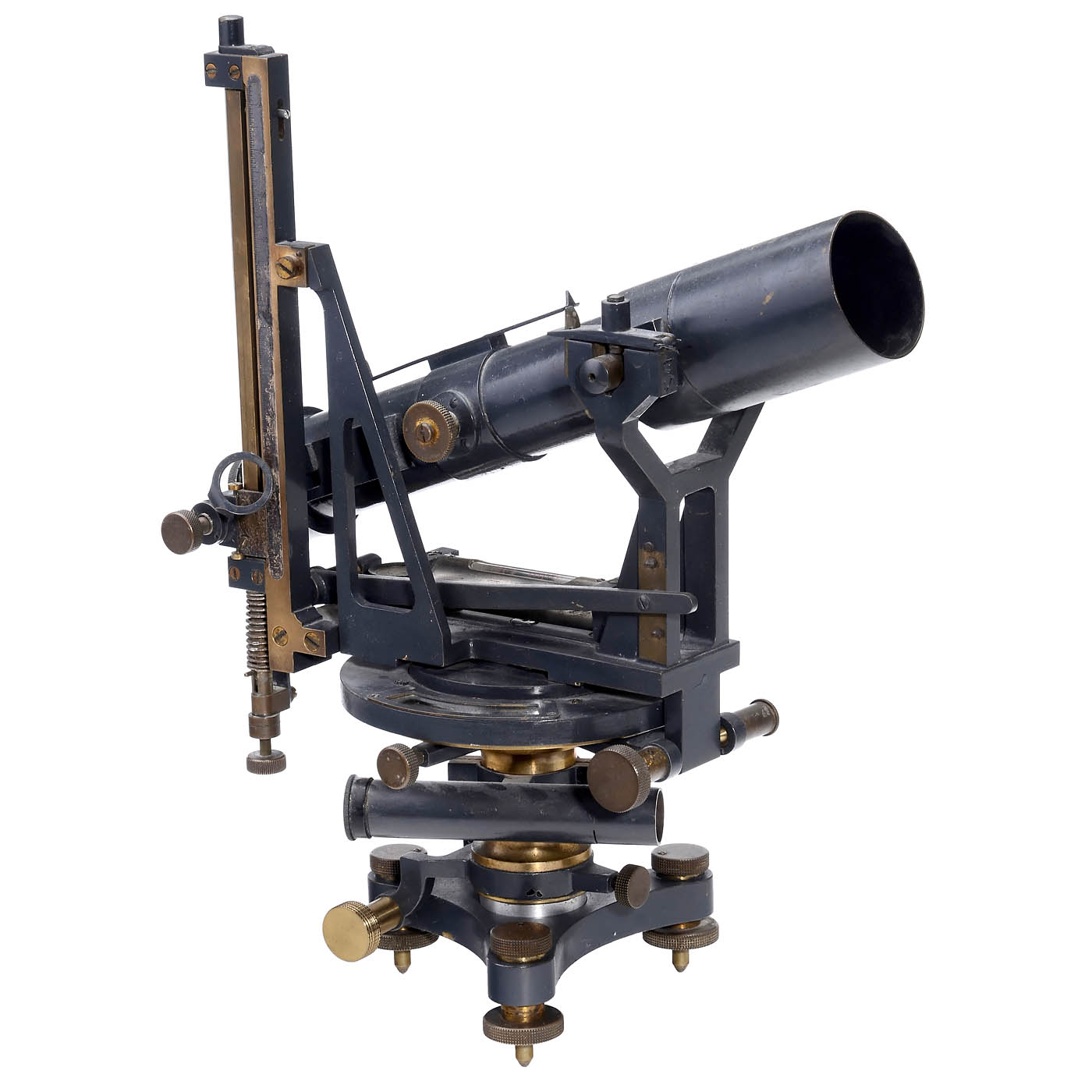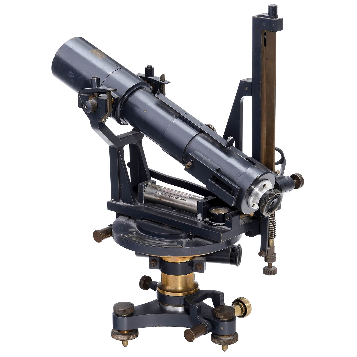 Signed: "A. Lepetit, Montrouge (Seine)". Grey-lacquered brass, silver-plated scales, 1 circular and 1 stick level, telescope length 11 3/5 in., total height 13 ¾ in. The special feature of this device is the attachment of the telescope. The telescope is hooked into a fork-shaped carrier at the objective and a vertical rail at the eyepiece. Tilting is done by a spring mechanism on the rail. The reading magnifier and the eyepiece of the control telescope are missing. A very rare model.