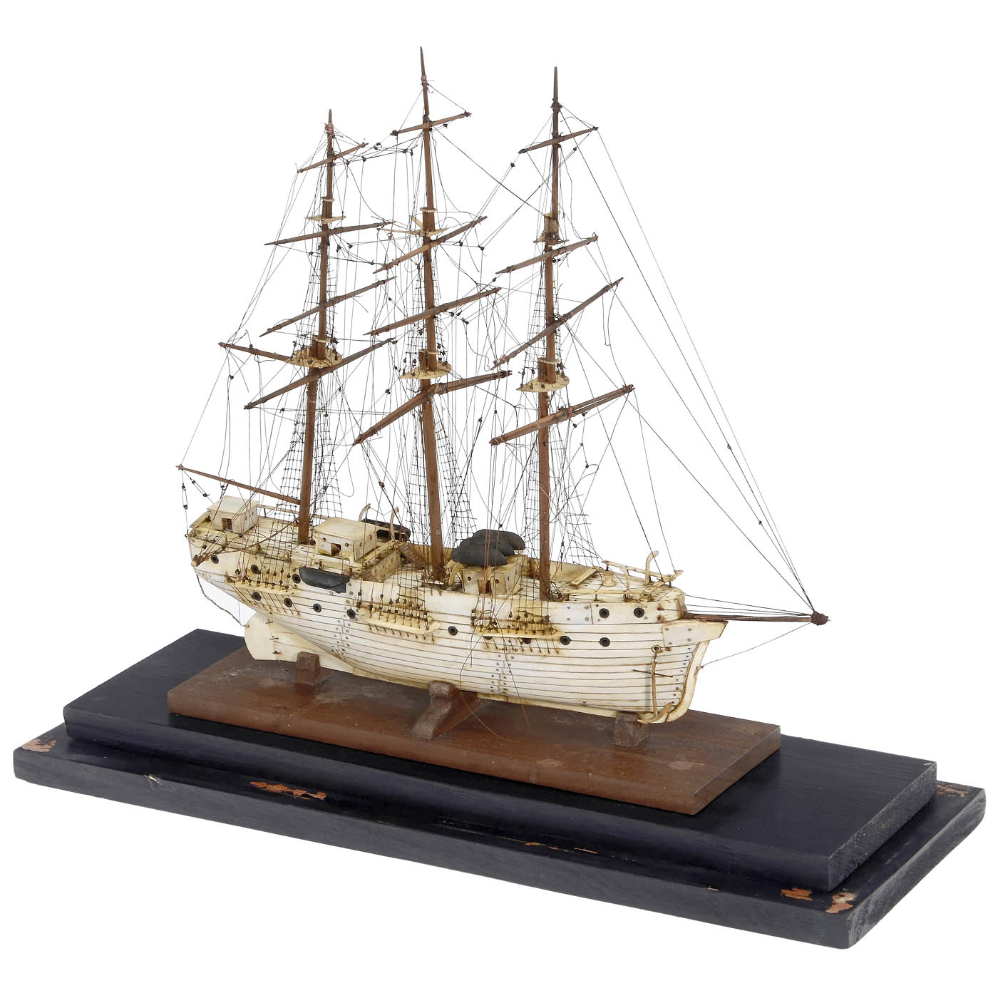 Bone-planked hull, carved-bone deck fittings, conical wood masts and yards, rigging slightly damaged, length of ship with bowsprit 15 in., with glazed cover, dimensions 20 ½ x 7 x 19 in.